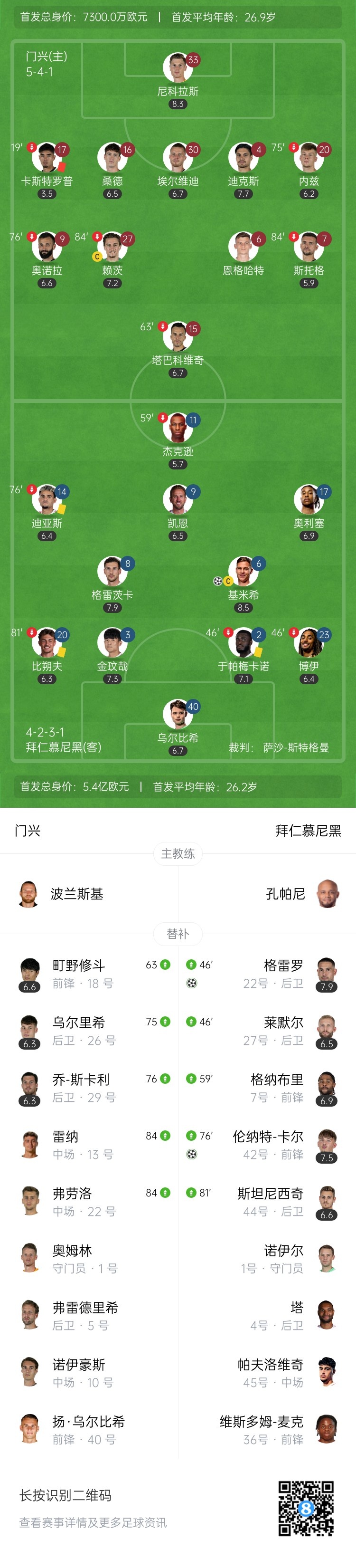 直播吧10月25日讯北京时间21:45,德甲第8轮门兴格拉德巴赫vs拜仁慕尼黑。上半场,迪亚斯开场失单刀;卡斯特罗普飞铲迪亚斯染红;于帕梅卡诺离谱手球染黄!下半场,凯恩破门因越位无效,随后基米希、格雷罗破门;比朔夫送点,斯托格点射击中立柱!17岁卡尔替补登场世界波锁定胜局!最终,拜仁3-0击败十人门兴,8连胜领跑德甲!门兴则8轮不胜继续垫底。