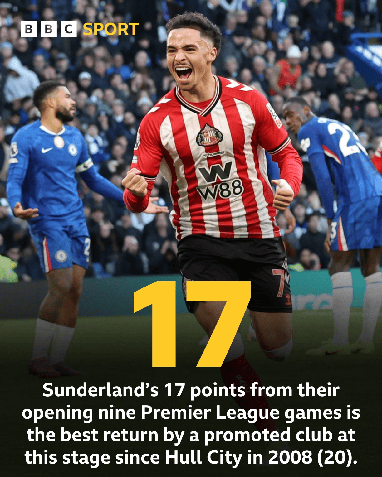 BBC对桑德兰的积分进行了统计,表示本赛季的桑德兰是2008-09赛季的赫尔城以来,英超前9轮获得分数最高的升班马——当时赫尔城在前9轮拿到了20个积分。
