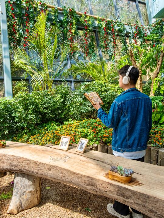 在这里可以俯瞰整个园区,并且还有电梯。还有各种动物如孔雀、松鼠、兔子等等,并且蝴蝶馆里还有漫天飞舞的蝴蝶,感觉就到了莫奈的花园。