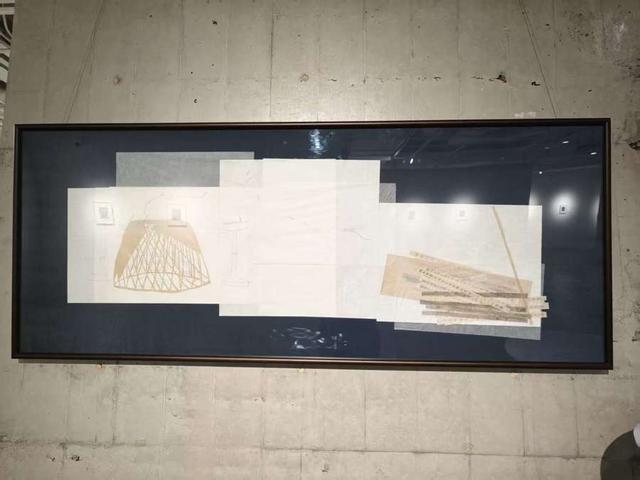 此次亮相的新作系列,受启发于中国汉代恢弘而深邃的墓葬文化——形态与功能各异的木俑、食器、乐器、礼器等,共同构筑了一个微缩的永恒世界。《摹汉·案》是该系列中的一件。它试图复现一个夜晚焚香伏案的场景:夜色浸染的案头,竹简散落,一旁的香笼氤氲出缕缕青烟。此作大量运用了彩色复写纸这一现代材料进行手工描画与复制。利用纸张半透明特性,通过剪纸与拼贴,层叠出夜晚的深邃而朦胧。