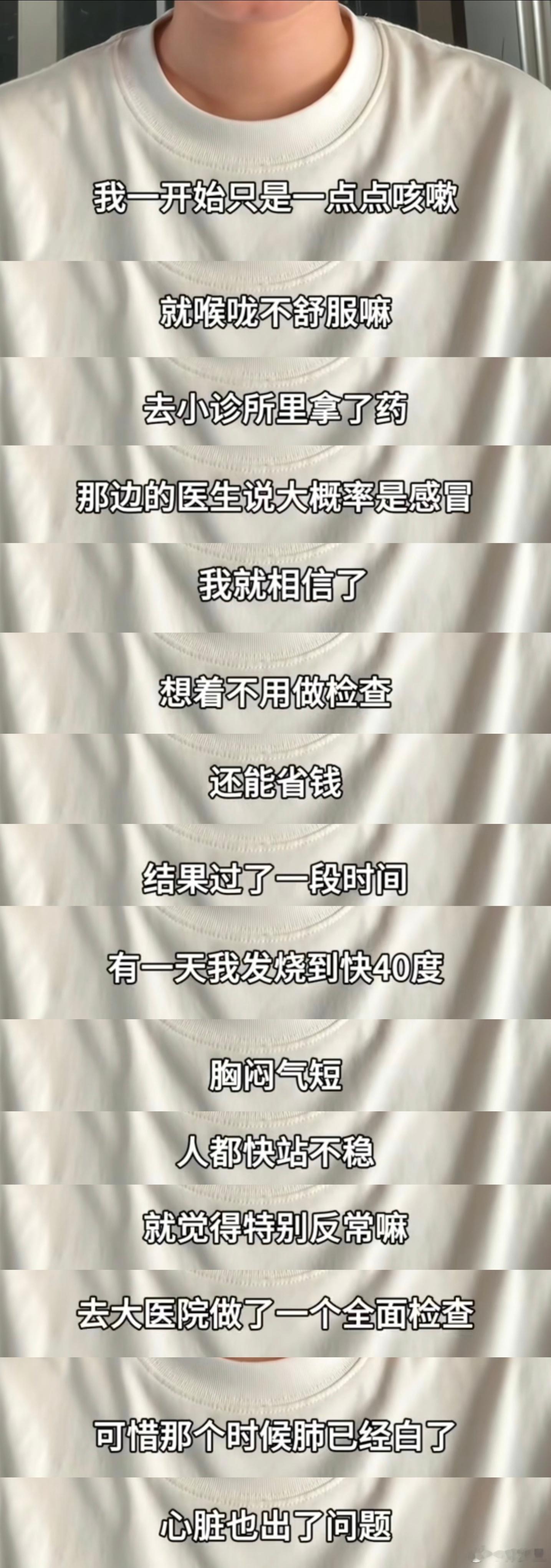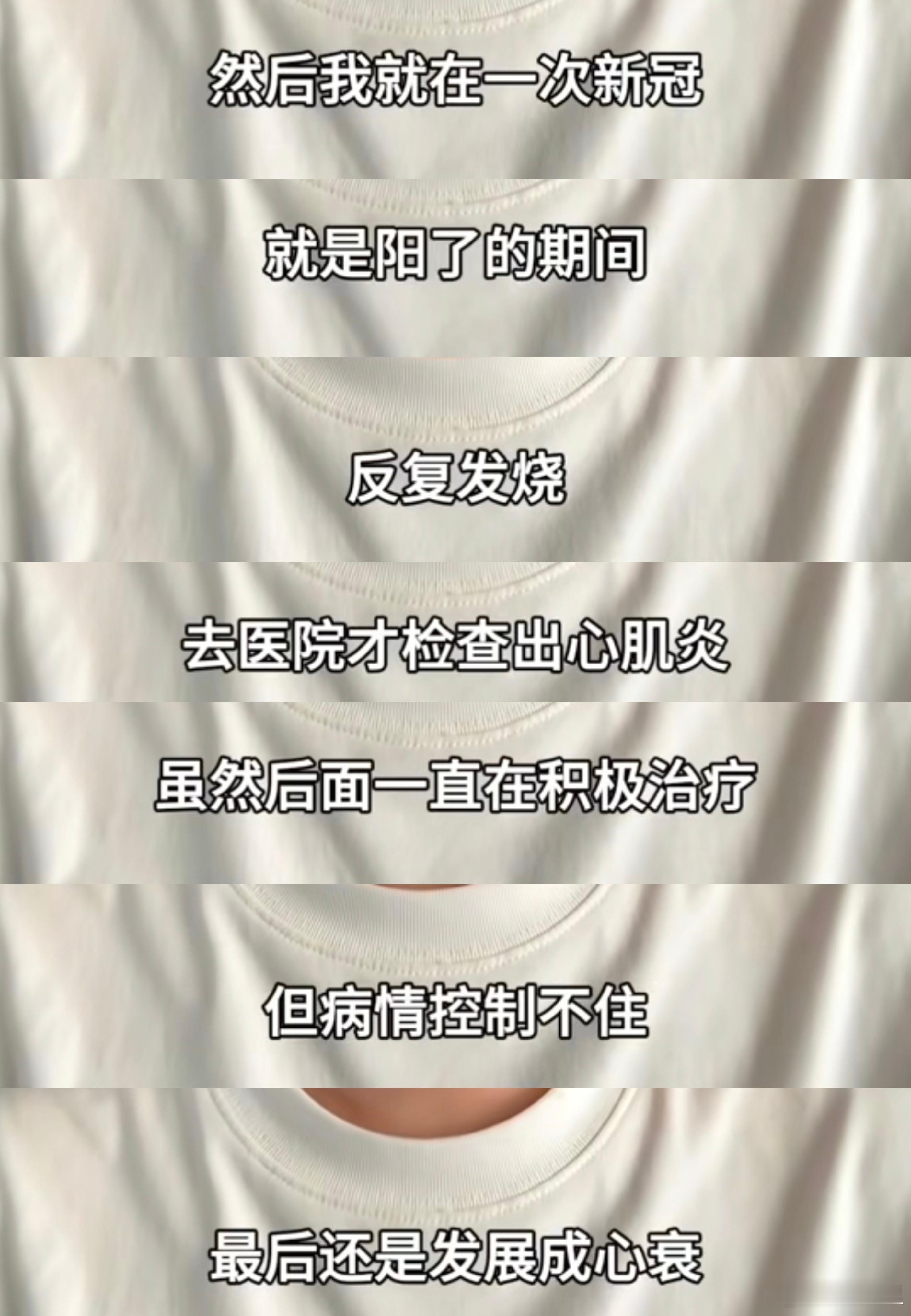 ✨后来,有一天发烧到40°,胸闷气短,站不稳,反复发烧,检查出来肺已经白了、心肌炎,最后发展成心衰。