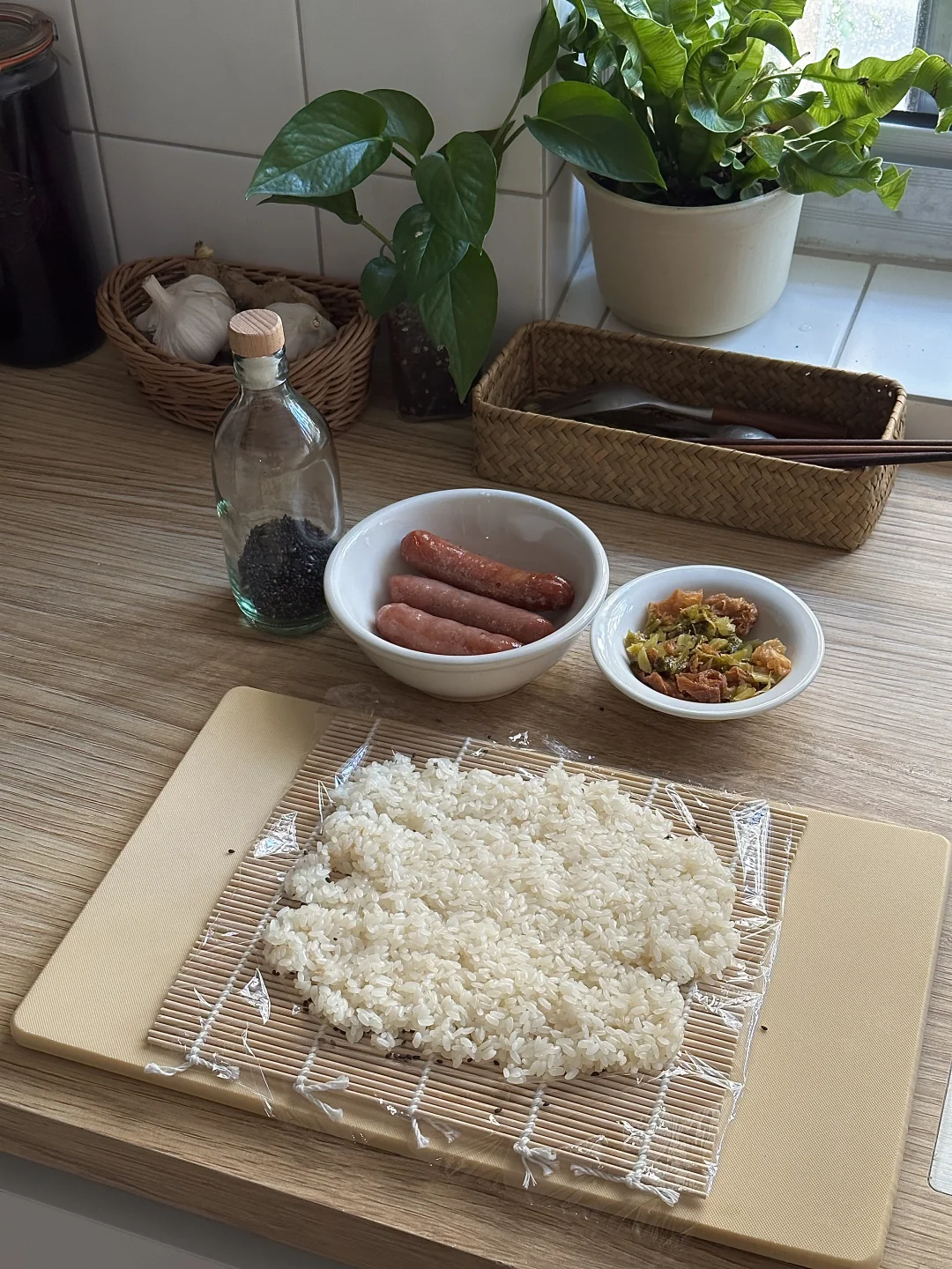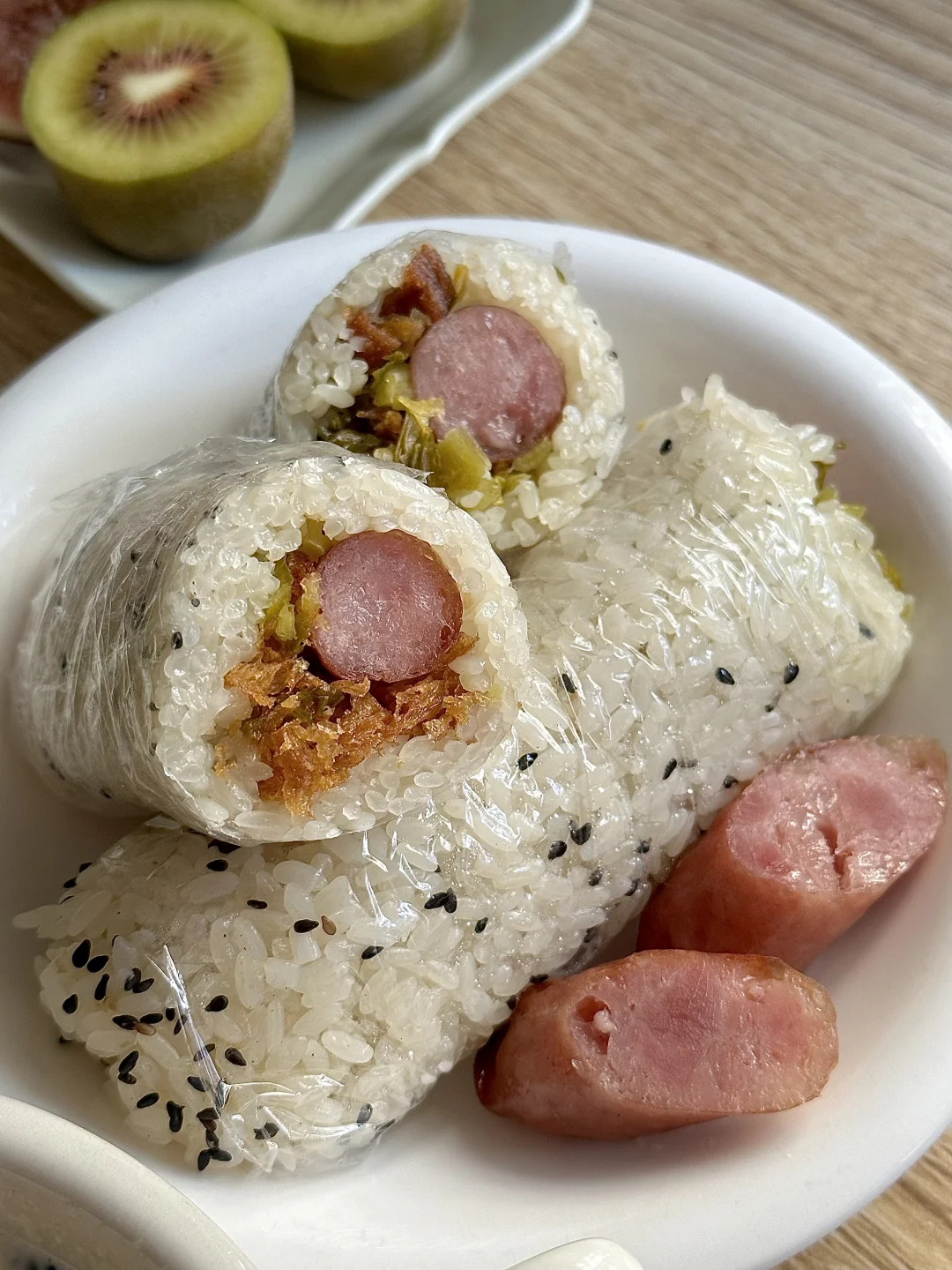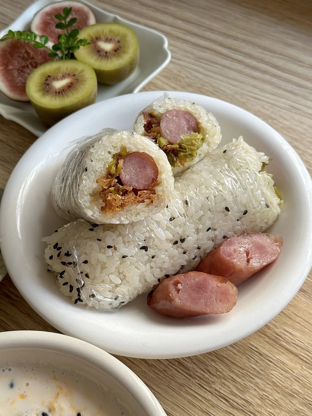 偷懒买了蒸好的糯米,自己加了烤肠、油条碎和雪菜,卷得紧紧的,一口下去糯叽叽,大满足!碳水快乐,谁懂啊!