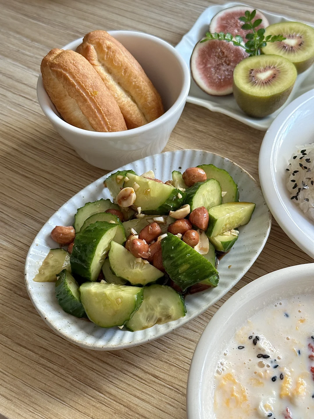 清爽担当!黄瓜切块,加蒜末、生抽、醋、香油一拌,最后撒上酥脆的花生米。解腻又开胃,和糯米饭团是绝配。