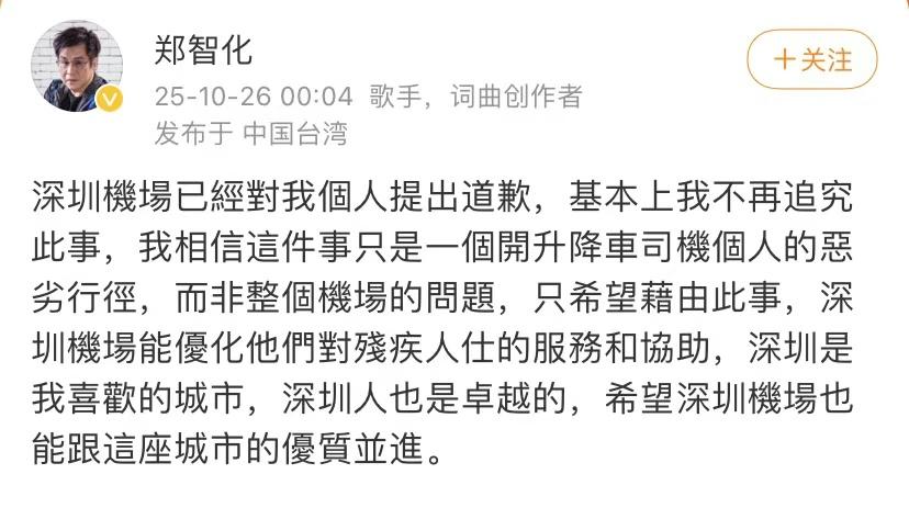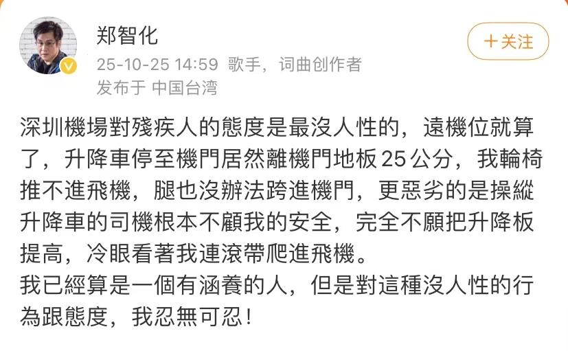 天呀!郑智化这谎说的太过分了!他应该跟机场工作人员道歉,登机图曝光出来,真的冤枉了人家! 幸亏有监控,事实上机场人员一直都在辅助服务郑智化登机,甚至还用手托举了他腰部腿部,防止他没有站稳摔倒,如此贴心的服务,居然被郑智化污蔑成工作人员全程冷眼看着他“连滚带爬”的自己登机。还在凌晨发了第二张帖子出来,专门点名就是机场开升降车司机个人问题,这跟污蔑机场工作人员没什么区别,他应该跟机场工作人员道歉才对。 幸亏有监控,不知道被波及的这位升降车司机有没有被炒鱿鱼,如果被炒了那真的好冤枉。