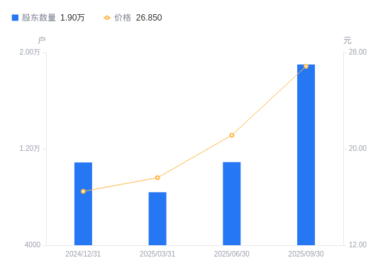 日期A股户数(户)流通A股户均持股数(股)户均持股市值(万元)2025-09-30189994817.1212.932025-06-30108918389.4717.732025-03-31839212710.5222.372024-12-31108682674.524.402024-09-30100112903.484.912024-06-30102852826.134.662024-03-31119202438.484.162023-12-31147081976.254.642023-09-3080173625.637.992023-06-3097532980.286.50
