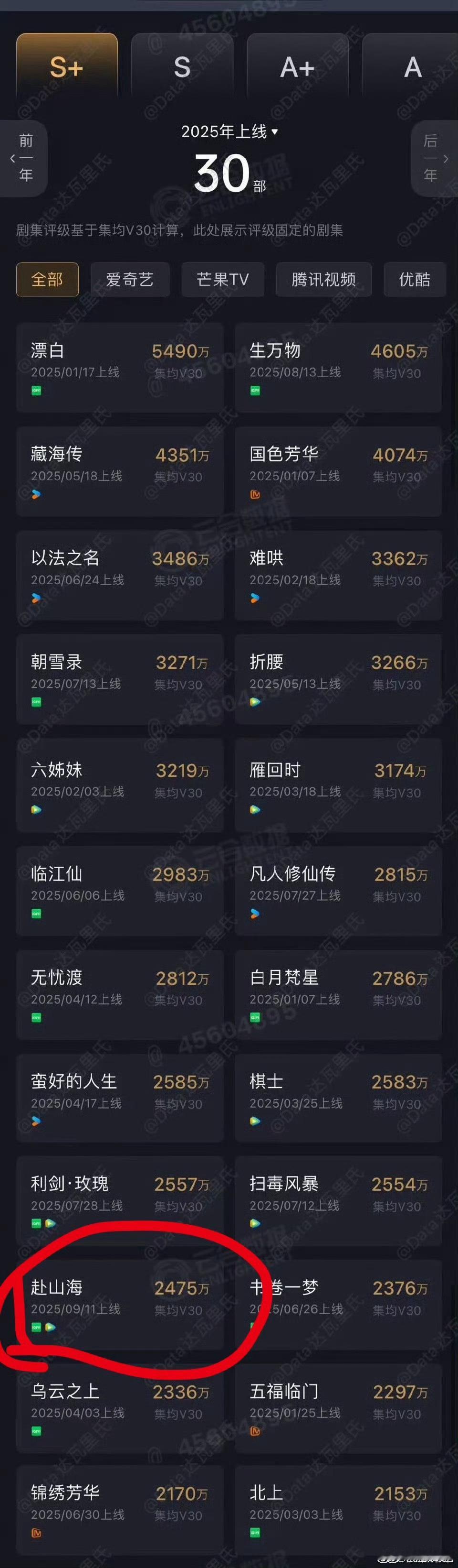 从未有哪个扛剧生能有几部剧都集均不到一千,底盘2k是一个大流量的底盘,但他现代剧南风1098,古装剧与君歌630长安诺1119,谍战戏深浅1050