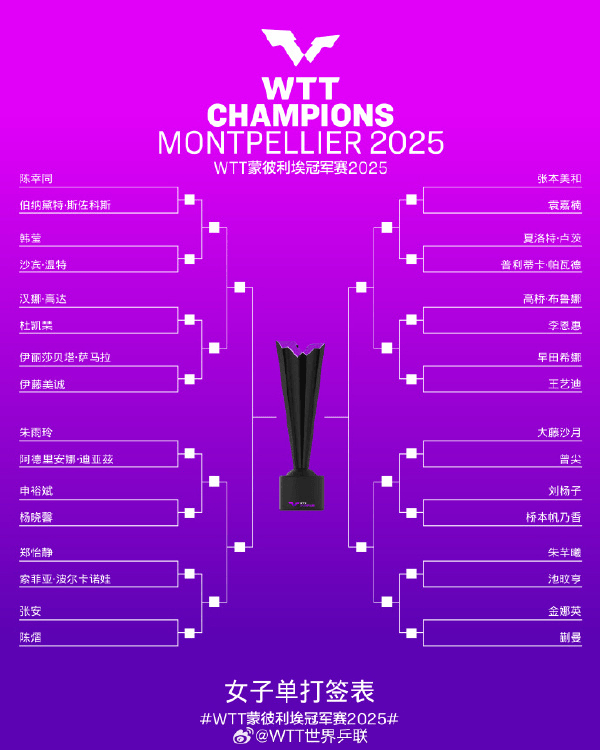 虎扑10月26日讯WTT蒙彼利埃冠军赛女单签表出炉。陈幸同作为头号种子出战,与朱雨玲、陈熠以及伊藤美诚位于上半区。