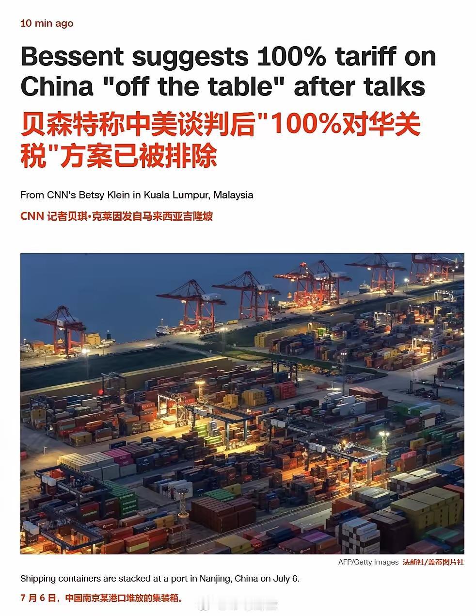 贝森特:中美谈判后,“100%对华关税”方案已被排除 据CNN10月26日报道,美国财政部长贝森特表示,在与中国代表进行"非常良好"的贸易谈判后,此前计划对中国加征100%关税的措施“实际上已被排除搁置”。 谈判前极限施压,给自己创造一张好牌,这手用多了就不管用了。就是开高价往下谈,每次都是故伎重演的套路,变来变去的,谁还信他们说的话。 不得不说,老美这是自己给自己下台阶,其实有求于人还嘴硬。 大家对此怎么看?欢迎在评论区留言,共同交流探讨!