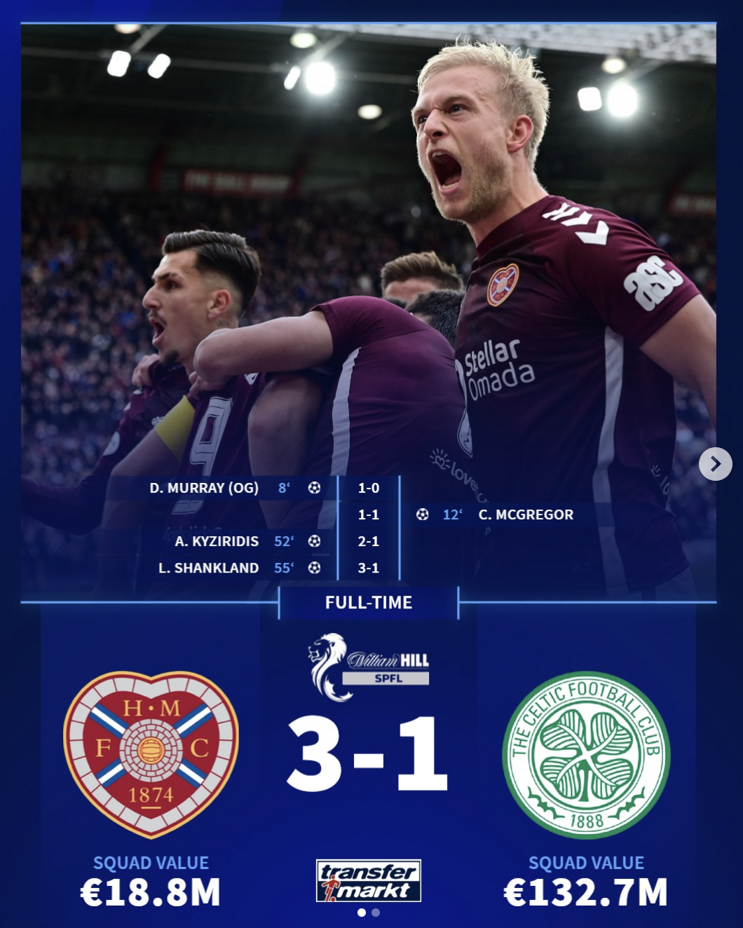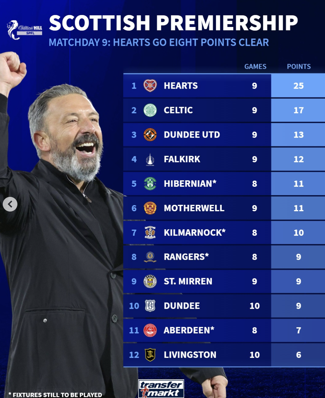 虎扑10月26日讯本轮苏格兰超级联赛第9轮,哈茨主场3-1战胜凯尔特人后,哈茨如今在积分榜上领先凯尔特人多达8分。