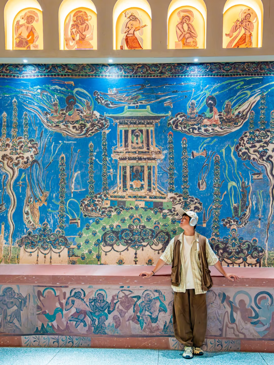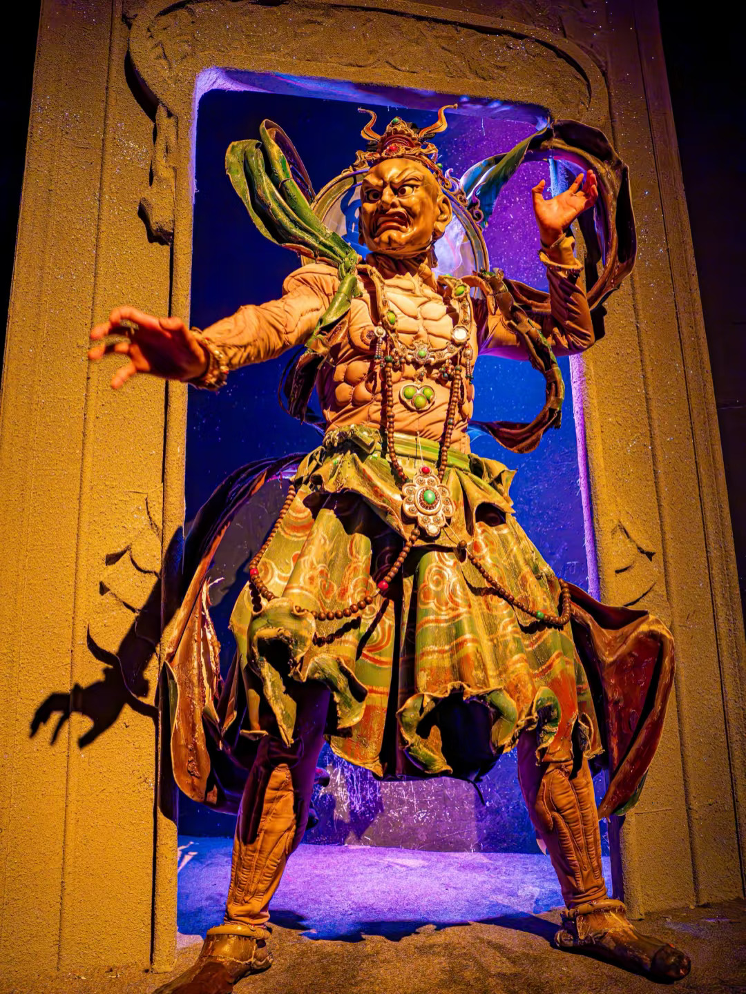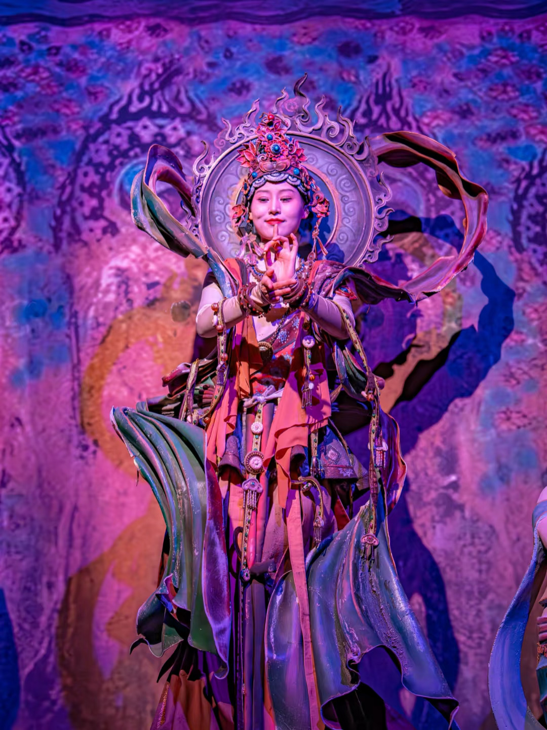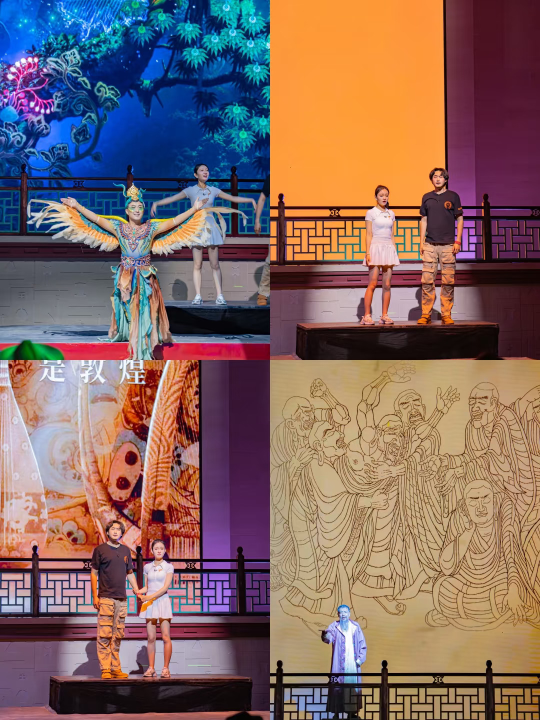从莫高窟数字展示中心出来,步行5分钟左右就到了乐动敦煌。看完静态的壁画,再来看“活的敦煌壁画”。 70min演出前25分钟行进式观演,最喜欢B区怒目金刚破壁而出那一瞬间,还有墙壁里翩翩起舞的伎乐师,以及C区让人挪不开眼睛的飞天飞纱和飞天撒花,仿佛穿越回莫高窟盛唐时期的黄金时代。