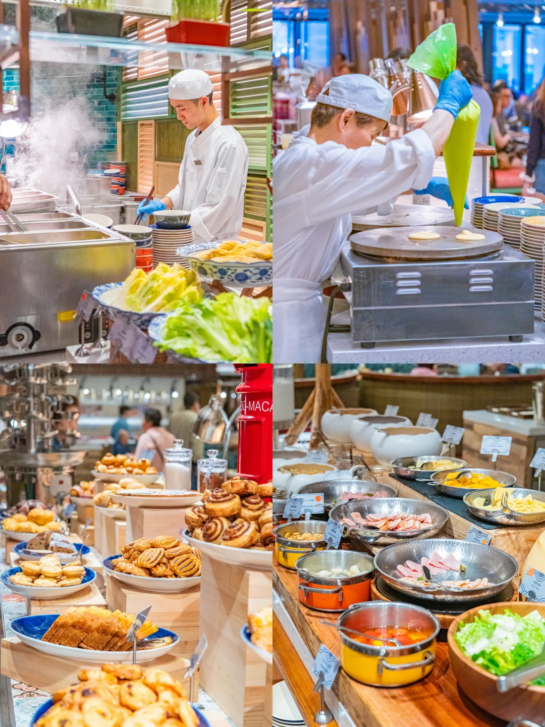 中式、西式早餐都有,现点现煮的热汤面、面包甜品统统都有,饮品种类也很丰富。