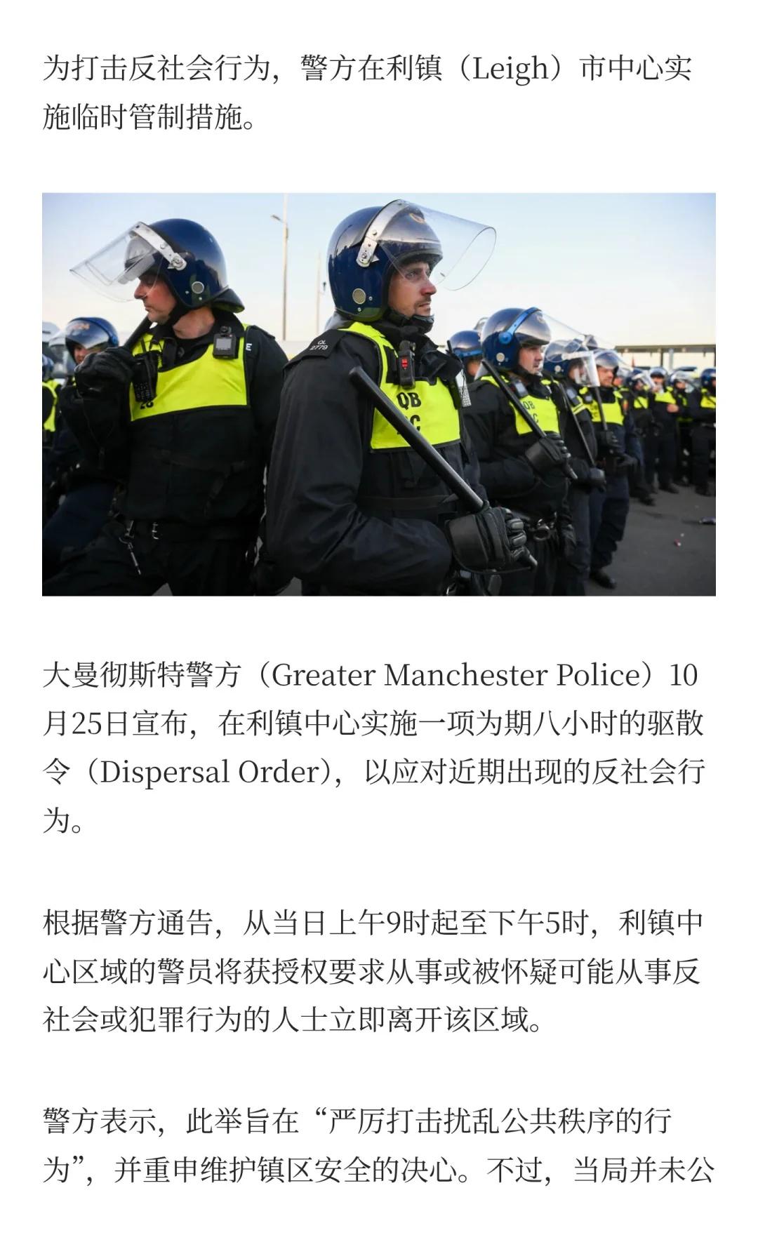 大曼彻斯特Leigh镇中心发布八小时驱逐令 大曼彻斯特警方(Greater Manchester Police)10月25日宣布,在利镇中心实施一项为期八小时的驱散令(Dispersal Order),以应对近期出现的反社会行为。曼彻斯特 新闻 生活 伯明翰 英国工作 英国留学生 海外 伦敦生活 伦敦 英国