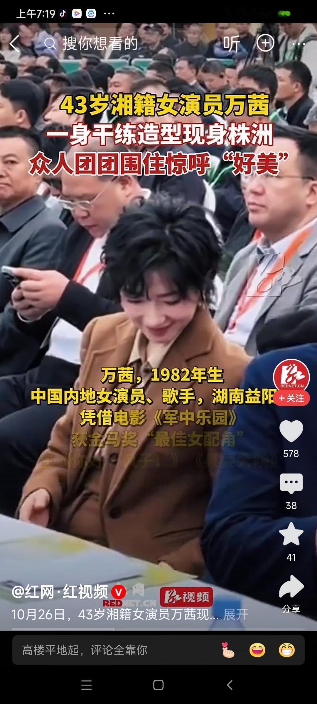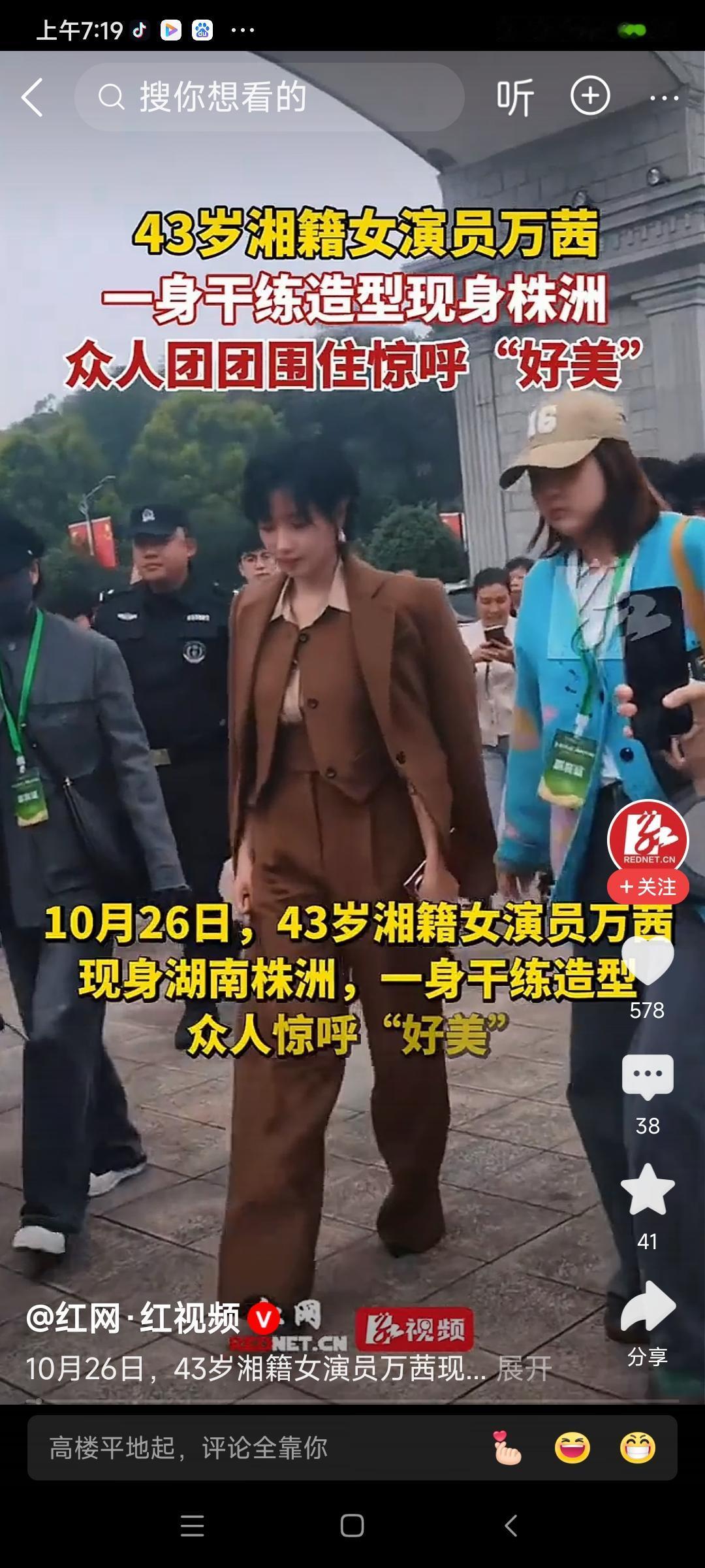 赞万茜株洲干练亮相 株洲街头倩影翩, 万茜身姿显干练。 利落造型彰风采, 星芒轻绽惹目怜。
