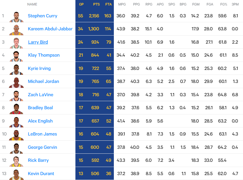 库里单场得到35分及以上且罚球出手次数不超过4次的比赛场次最多,共55场。克莱排在第4有21场。