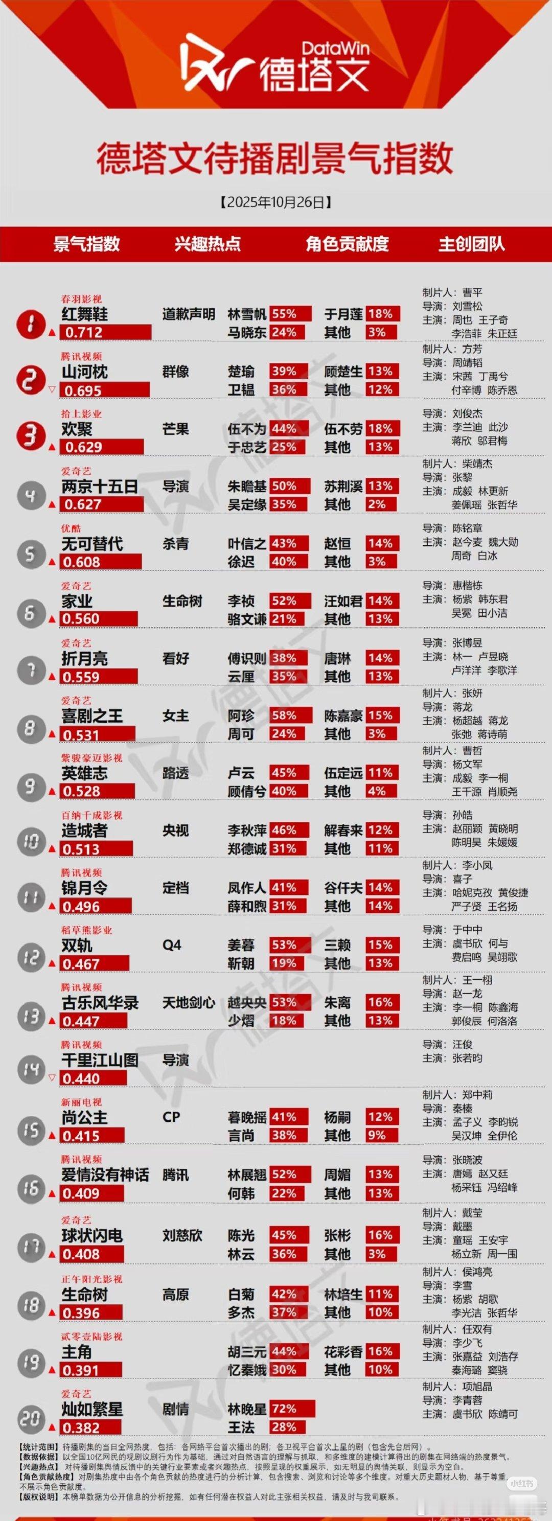 待播剧:top1周也、王子哥红舞鞋、top2荣茜丁禹兮山河枕 top3龚俊暗河传