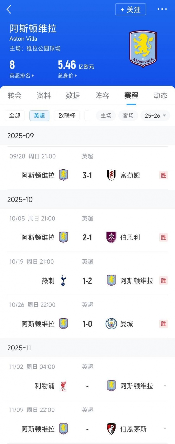 埃梅里的球队赛季初一度0胜3平2负,在降级区挣扎。但是从第6轮开始维拉狂揽4连胜,击败富勒姆、伯恩利、热刺和曼城,现在已经升至英超第8位,积分15分。