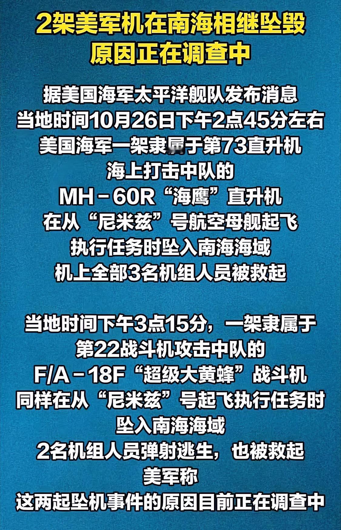 美太平洋舰队心真大,都先坠海一架了还敢不信邪继续,直到半小时后再掉一架才终于开悟…… 半小时内接连坠海两架,还是不同款飞机,按照概率来说这绝对很离谱。按照台湾省名嘴于北辰的计算方式,但就是百分百的意外了。也许这是美国"尼米兹"号航母(现役最老航母)为了庆祝最后一次部署故意搞的独特庆祝方式,也许是三哥看不惯被制裁给予的小小警告。但总归,81192收到了不错的祭品。