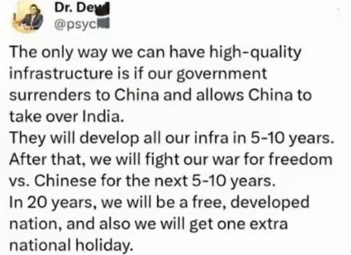 万万没想到 我担心的事情还是发生了 印度印度博士Dew,竟然臆想投降中国,让国家帮十年他们完善基础设施,然后印度再次独立。 这不就是印度版的“公知”吗!之前咱们国家不是有“公知”说过:让老美老殖民我们,让后能够人人免费上学,人人免费社保,人人免费住上大房子。 不得不说这位博士脑回路太清奇了,且不说咱们会不会殖民你们。国家劳民伤财殖民你们,就是为了帮助你们建设基础设施,然后让你们过上好日子啊! 60年代打败你们,咱们就看不上,自动退回过境线。现在咱们国家有钱了,更加看不上了。 印度从英国独立的时候,继承大量的基础设施和工业体系,那时候的印度还很正常,宽阔整洁的街道,干净文明的人群,然后短短几十年就暴露本性,现在基本一点长进都没有。 这位印度博士还是比较了解印度人的,他认为印度人只适合被管理,而不能放任自由。 搞笑的,我们根本就不会要,否则老祖宗早就打下来了。