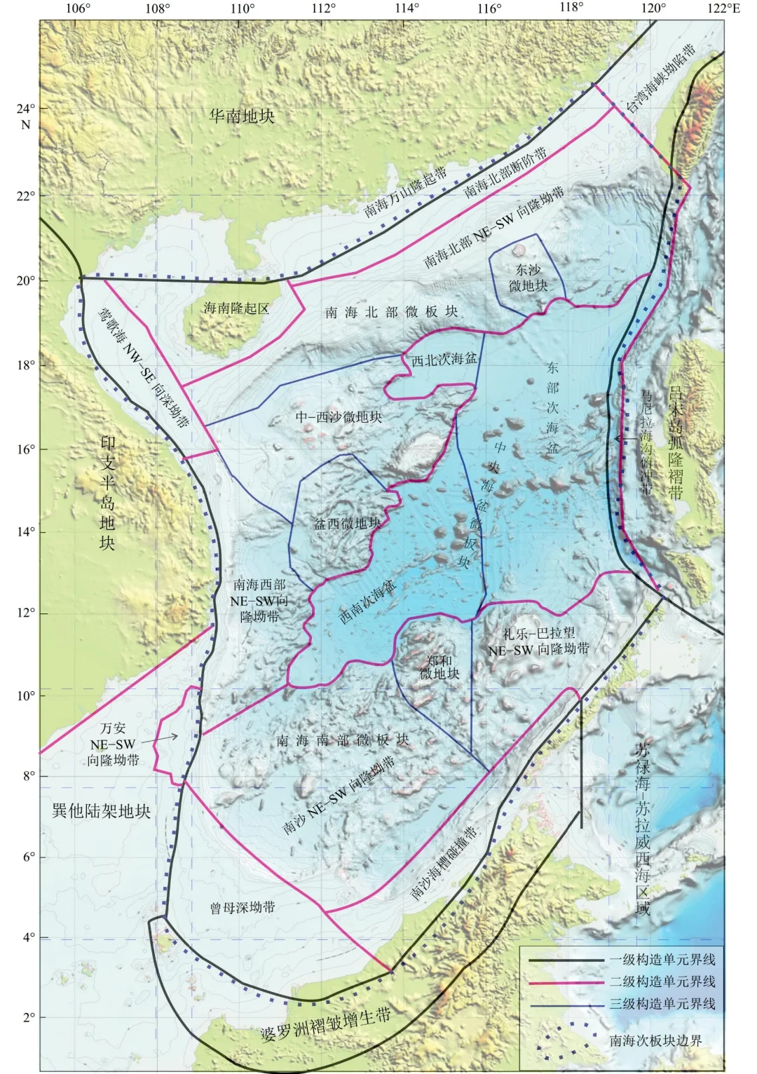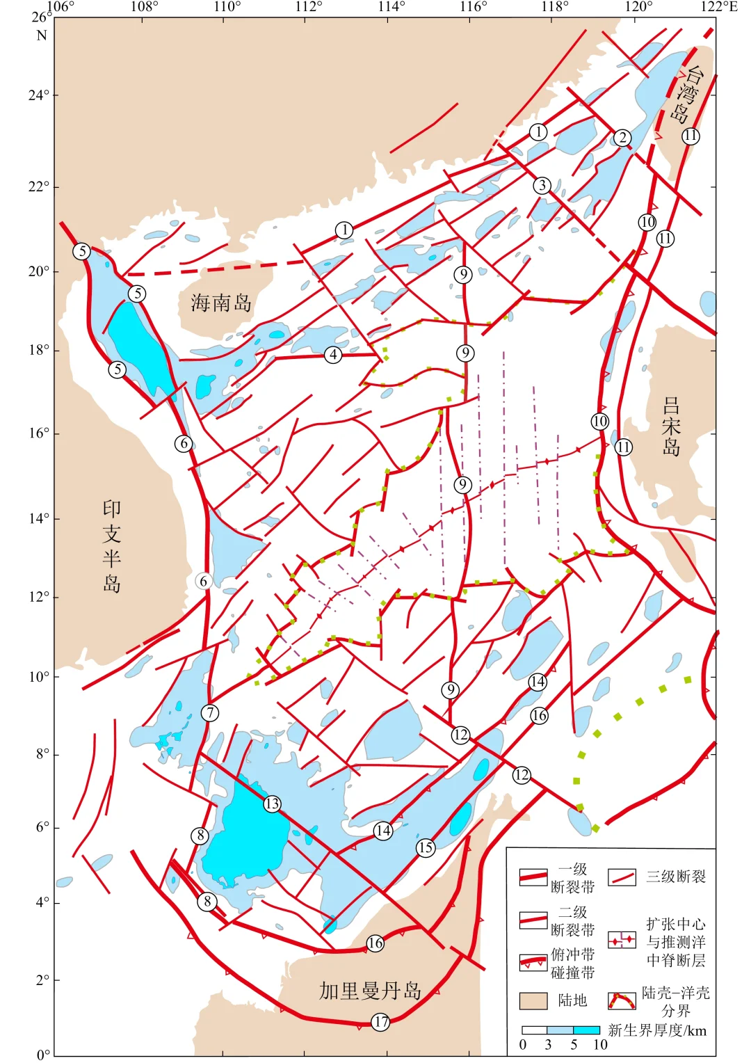 🇨🇳约3,200万年前,古南海向婆罗洲俯冲,引发欧亚板块东南缘拉张,形成新南海。海底扩张分两阶段:1⃣东部次海盆(32-16百万年)、2⃣西南次海盆(23-16百万年),扩张停止后断裂带持续活动。 📻区内一级断裂带主要有滨海断裂带、红河断裂带、南海西缘断裂带、马尼拉海沟断裂带、武吉米辛断裂带、卢帕尔断裂带等。二级断裂带主要有九龙江断裂带、浅滩西南断裂带、万安东断裂带、曾母西断裂带、中南-礼乐断裂带、吕宋海槽断裂带、巴拉巴克断裂带、南沙海槽东南缘断裂带、西巴拉望-克拉维特断裂带、廷贾断裂带等。