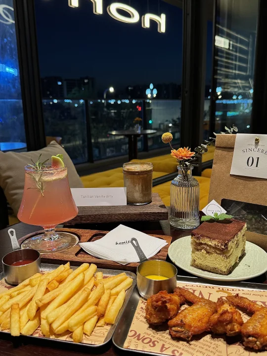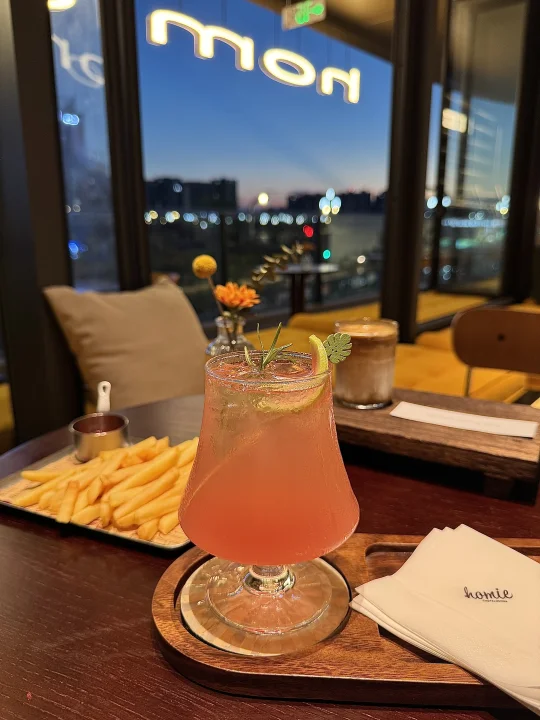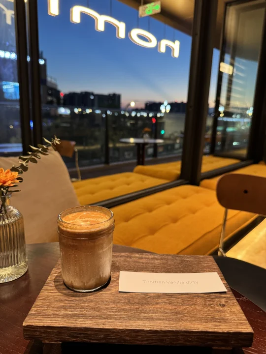 端上来真的绝! 杯壁结满白霜,喝第一口直接被惊艳到! 店里装修是我很爱的木质调 拍照巨出片 拿着冰杯随便拍都氛围感拉满~ 能呆上一整天 七点后的落日晚霞真的绝美🌆