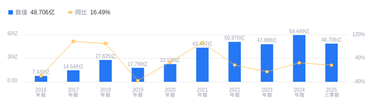 2025年三季度,寒锐钴业营业收入为48.71亿元,行业排名4/4。行业第一名华友钴业营收589.41亿元,第二名盛屯矿业营收217.17亿元,行业平均数为228.2亿元,中位数为137.34亿元。主营业务构成中,铜产品营收18.43亿元,占比58.62%;钴产品营收12.72亿元,占比40.46%;其他(补充)营收2894.79万元,占比0.92%。当期净利润为2.22亿元,行业排名同样为4/4,行业第一名华友钴业净利润51.87亿元,第二名盛屯矿业净利润21.52亿元,行业平均数为20.77亿元,中位数为14.49亿元。