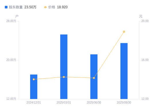 日期A股户数(户)流通A股户均持股数(股)户均持股市值(万元)2025-09-3023505014520.1027.472025-06-3021180616113.5622.822025-03-3125262813509.7819.272024-12-3117028720042.3428.102024-09-3018788918164.7127.602024-06-3017549519447.5629.822024-03-3122048015479.6320.922023-12-3126858112707.3415.212023-09-3025845713205.1018.932023-06-3027323512490.8919.10