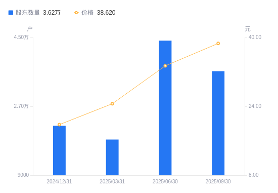 日期A股户数(户)流通A股户均持股数(股)户均持股市值(万元)2025-09-30362114556.0617.602025-06-30441693735.1912.482025-03-31183468984.0322.112024-12-31219287510.8714.842024-09-30292255635.5310.172024-06-30300105489.427.622024-03-31348984640.6712.072023-12-31384854203.1611.432023-09-30302605346.4315.082023-06-30334484836.8523.58