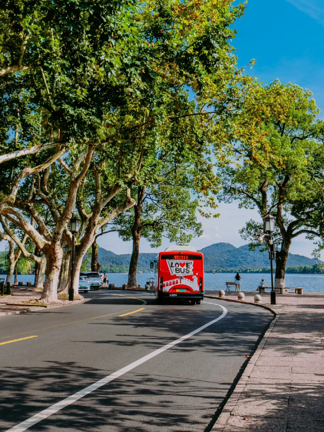 我竟然在西湖这个拐角拍到了最浪漫的公交车