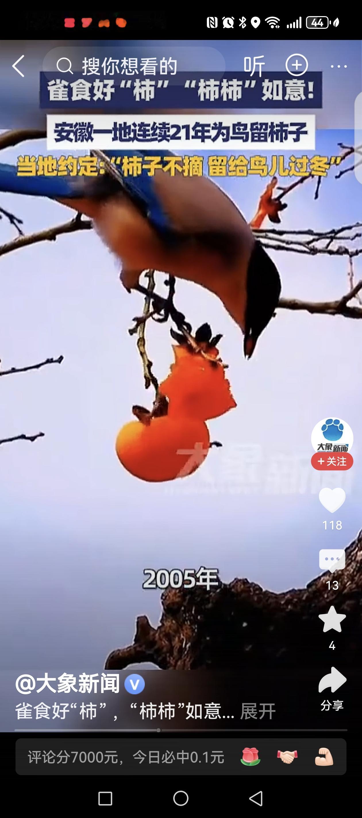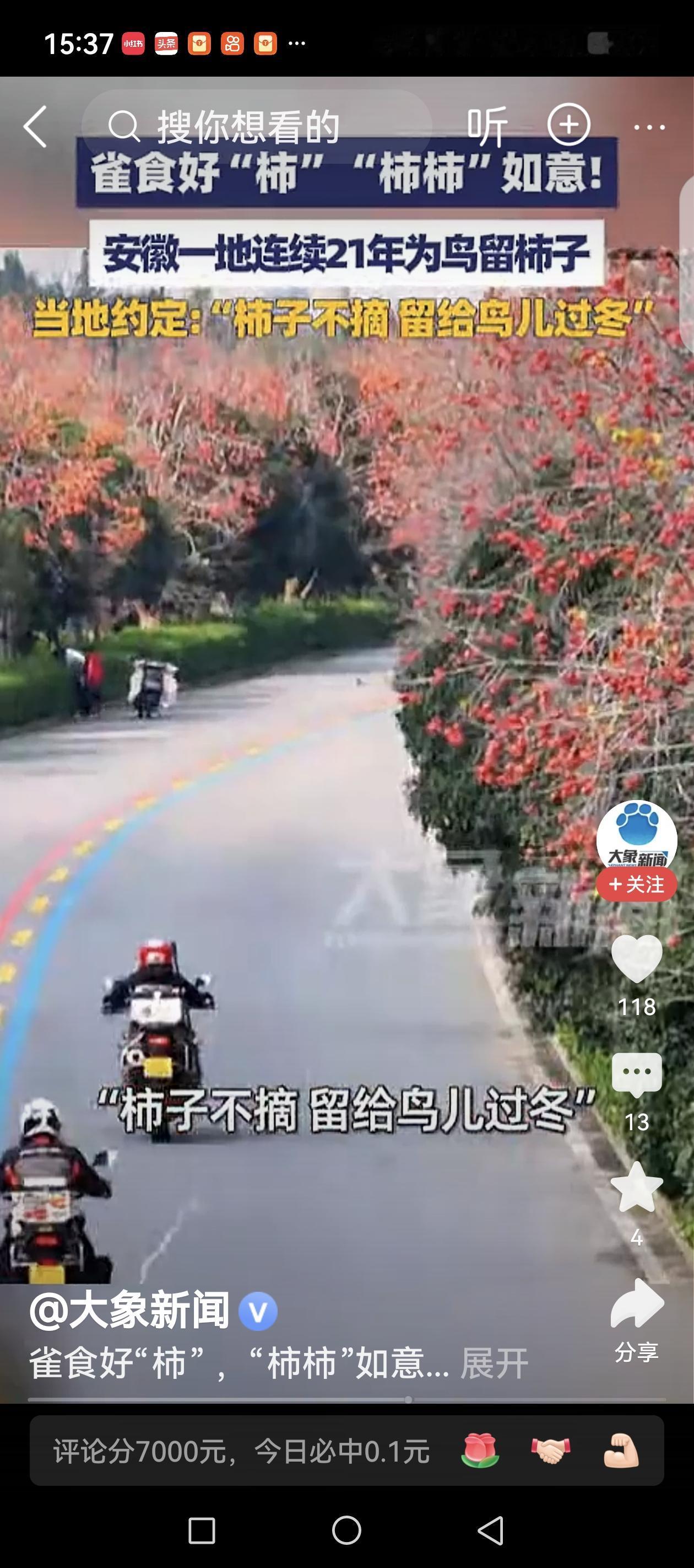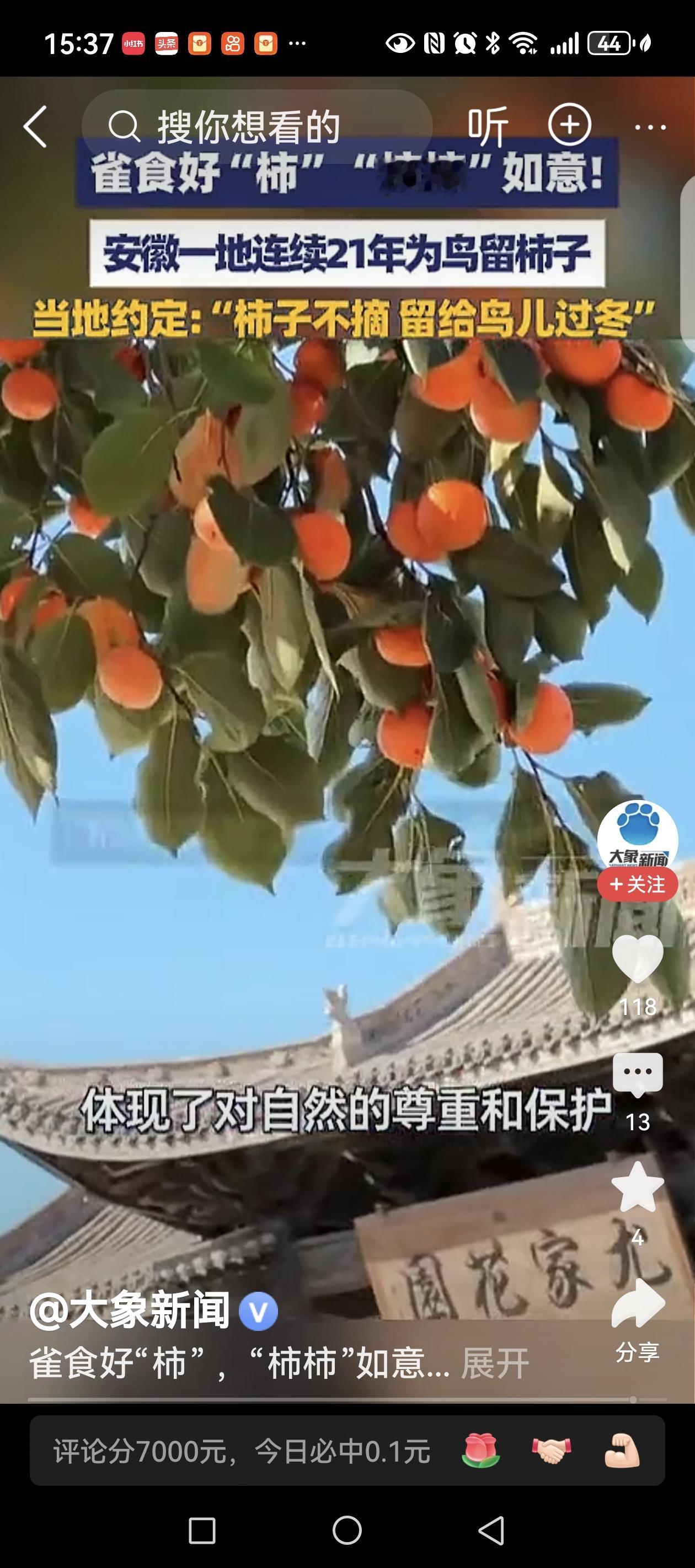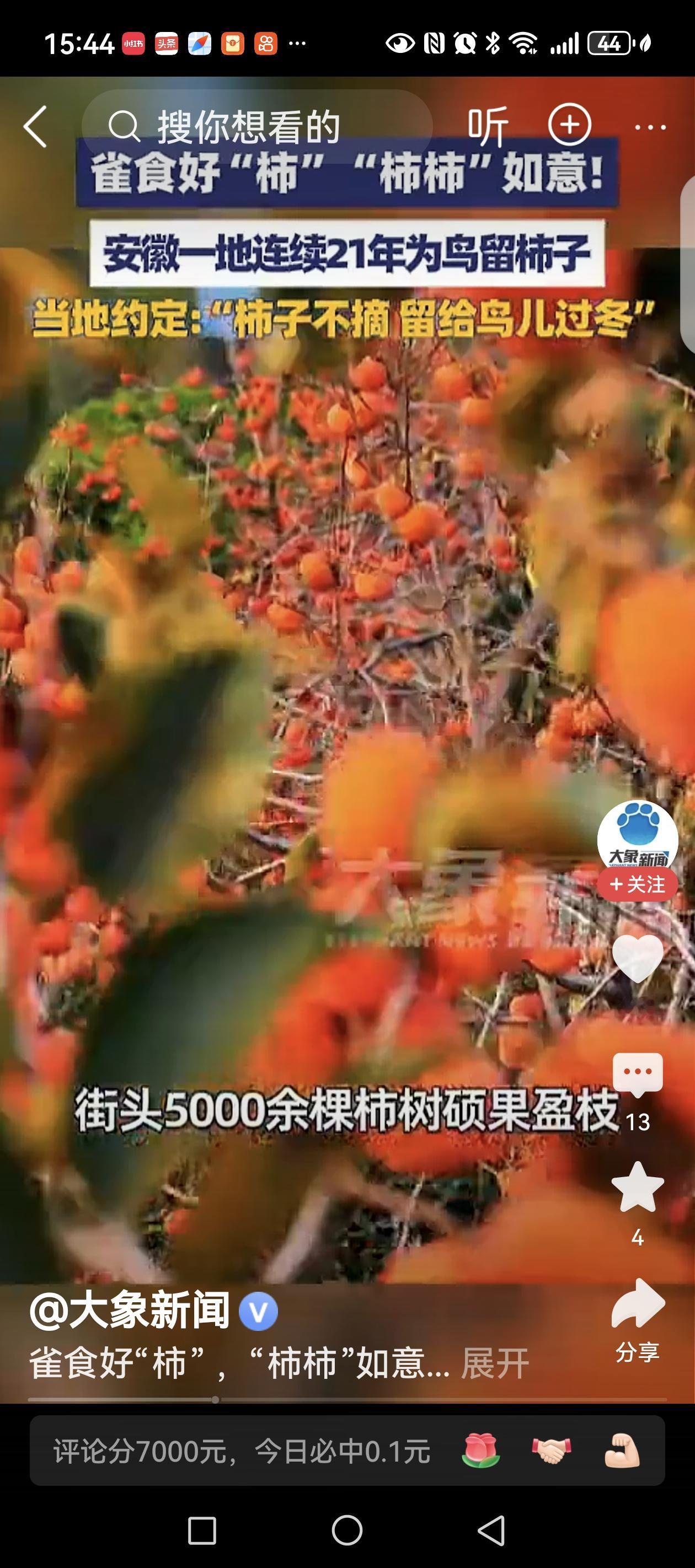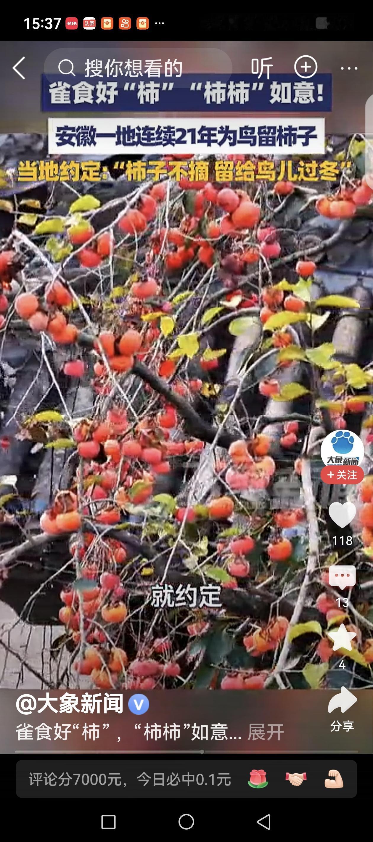 安徽这一地的做法堪称人与自然和谐相处的典范! 据媒体报道,安徽颍上连续21年为越冬的鸟儿留柿子,让鸟儿有足够的食物越冬。2005年,当地引进柿树作为行道树种时,就约定,“柿子不摘,留给鸟儿过冬”,既为鸟儿提供了过冬的“口粮”,也形成了的特色生态景观,体现了对自然的尊重和保护,可谓是一举两得。 难能可贵的是,这一坚持就是21年,也充分体现了当地居民超高的素质。街头是5000多棵硕果累累的柿树,红彤彤的柿子没有市民去采摘,这本身就是一道绝美的人文风景。是不是很值得我们学习!柿子和鸟 自然相处