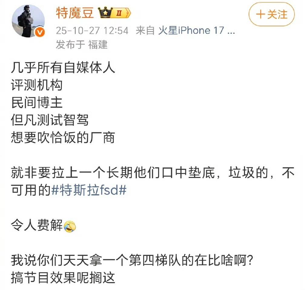 陈震:那让我来明确的告诉你!因为这个表现很差劲的国内版FSD,你们是真无脑吹啊! 这个博主其实是特斯拉的忠实粉丝,他能把粉丝基础做这么大,除了每次他发特斯拉比较新的概念新的产品之外,就是拥有一大批这种粉丝。 好多人还把他的说的话给当成了特斯拉官方说的话,其实这种细分的博主挺厉害的,因为关注他的粉丝必然而然是非常认可特斯拉的。 各位是怎么看的?欢迎评论区留言。