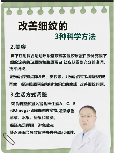 激光治疗激光治疗如点阵激光、皮秒激光等,可以刺激皮肤再生,促进胶原蛋白和弹性纤维的生成,从而改善细纹问题1。