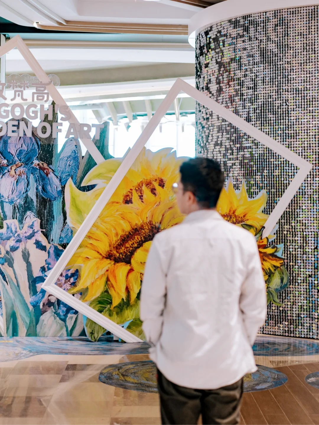 多媒体互动装置,把梵高所有作品画作融入,可以慢慢欣赏梵高的每一幅画作,《星空》《鸢尾花》《向日葵》都是经典画作,艺术细胞的慢慢熏陶~