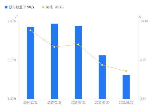 日期A股户数(户)流通A股户均持股数(股)户均持股市值(万元)2025-09-303984219118.1617.912025-06-304136718510.0617.582025-03-314364417544.3517.412025-02-284380517479.8717.252024-12-314356517576.1717.952024-09-304178118326.6520.752024-06-304303017794.6918.382024-03-314185018296.4318.562024-02-294073718796.3221.072023-12-313987419203.1323.83