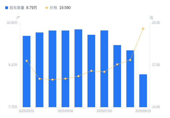日期A股户数(户)流通A股户均持股数(股)户均持股市值(万元)2025-09-308618523064.5244.882025-09-198791422610.9144.292025-08-089588320731.6835.992025-07-319764320358.0034.712025-07-2010251519390.4932.032025-07-1010105419670.8332.632025-06-3010286919323.7631.322025-05-3010246819399.3831.102025-04-1810248119396.9230.962025-04-1010182519521.8831.28