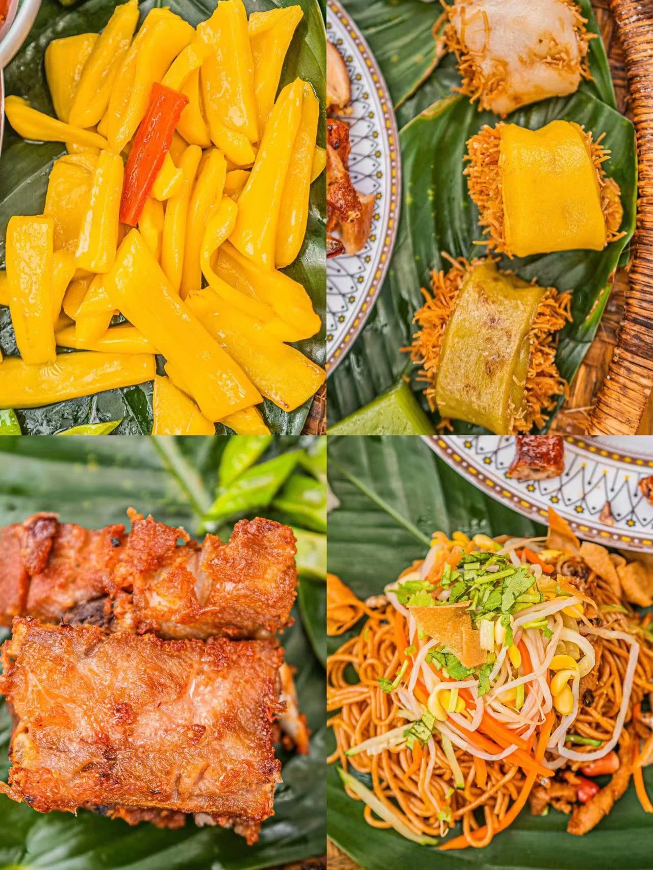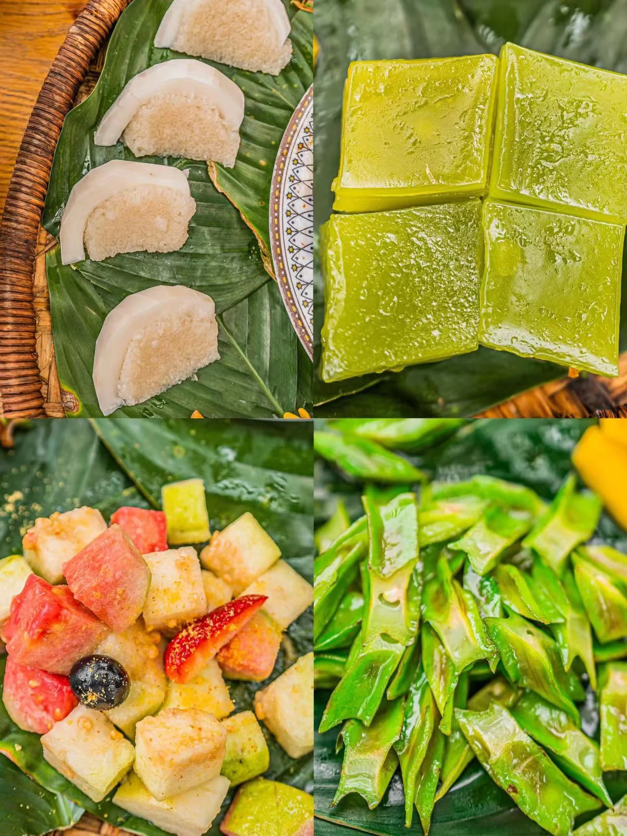 周围也是好多海南特色小吃:炒菠萝蜜、椰子糕、南姜番石榴、藤桥排骨、清炒四季豆、海南粉…