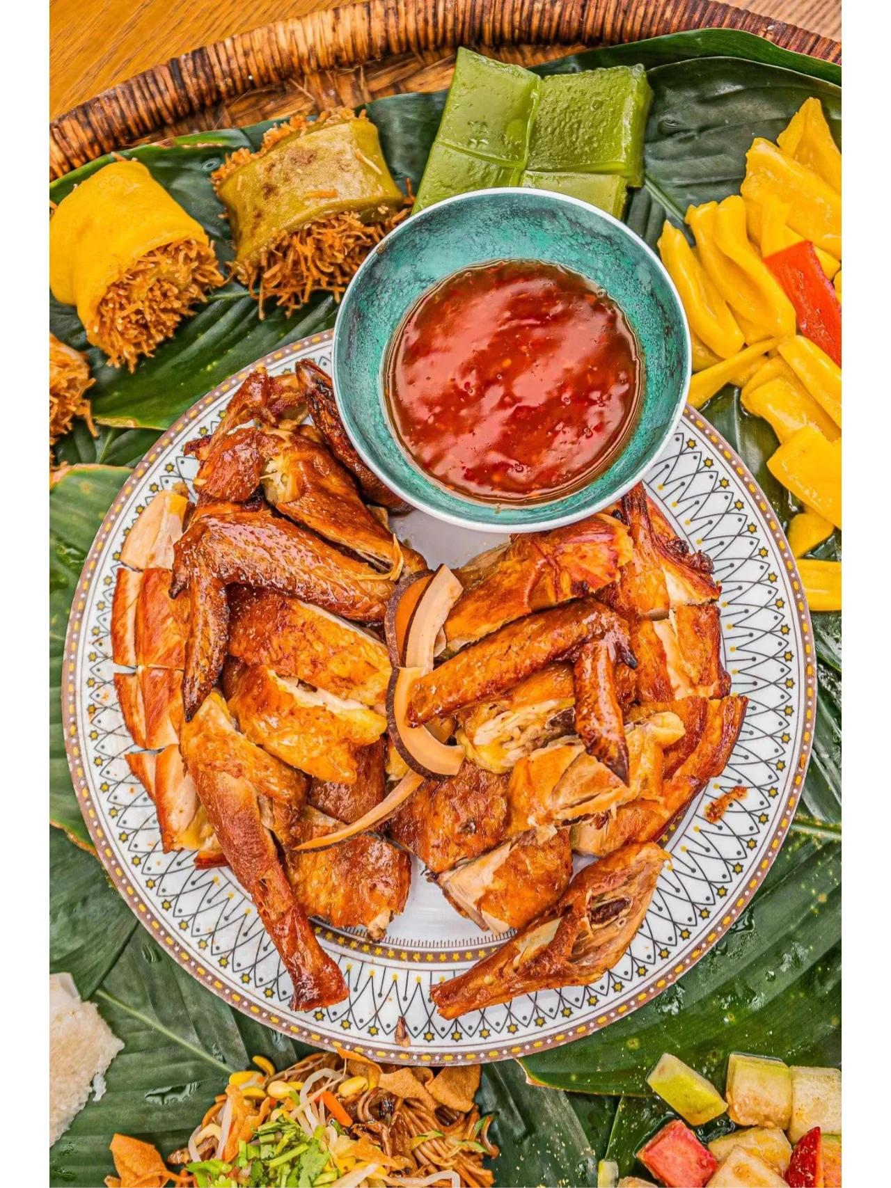 这个端上来的时候真的仪式感满满,是很有海南特色的一个簸箕装着,中间是一整只海南椰子鸡,旁边放着秘制蘸料。