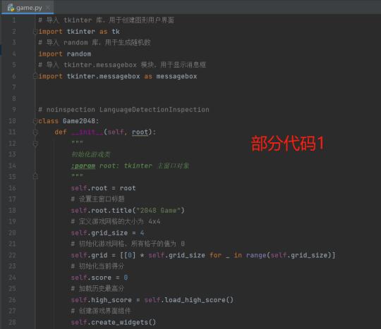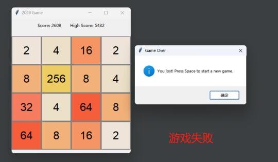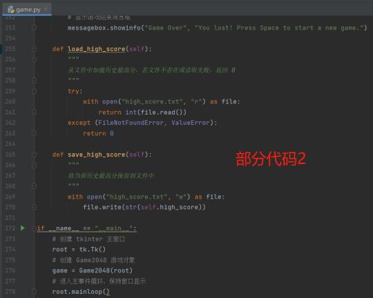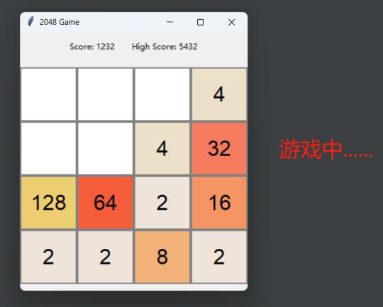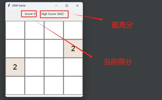🎮游戏介绍 : 2048 小游戏是Gabriele Cirulli 开发的一款数字游戏,曾风靡一时。2048小游戏要实现的功能包括2048游戏必要的数字移动逻辑,同时需要显示用户当前的得分并记录用户的最高得分;游戏主界面含4行4列共16个数字方块,用户可以通过上下左右4个方向键控制数字移动;如果相邻数字方块数值相等,则两个方块的数字相加合并为一个方块,同时每移动一次方块,在空白数字方块中随机选择一个方块并生成2或4的数字。 2048 游戏的功能实现可通过以下步骤进行实现: (1) 绘制主窗口界面,将游戏窗口分为上下两部分,上面部分显示当前得分及最高分,下面部分为游戏区域,分为4*4的数字方格; (2) 按收用户行为,实现接收用户的键盘操作,仅接受用户的方向键和空格键按键行为; (3) 根据用户方向按键行为进行数字方块移动,空格键重新开始游戏; (4) 显示用户当前得分,记录用户最高分。 实时计算用户当前得分并显示在得分区域,比较用户当前得分与最高分的大小,如果当前得分高于最高分,则将当前得分记为最高分并显示在最高分,最高分记录在文件以便永久保存。 ~ [火R]功能实现: 初始化部分:__init__ 方法完成游戏窗口的创建、游戏网格初始化、得分和最高分的加载,以及新游戏的启动。 界面创建:create_widgets 方法创建得分显示区域和 4x4 的游戏网格,同时绑定键盘事件。 新游戏开始:new_game 方法重置游戏网格和得分,添加两个初始数字方块。 数字方块生成:add_new_tile 方法在空白方块中随机选择一个生成 2 或 4。 界面更新:update_display 方法根据网格数据更新界面显示,不同数字对应不同颜色。 键盘事件处理:handle_key_event 方法处理用户的键盘输入,包括方向键和空格键。 数字移动和合并:move_left、move_right、move_up、move_down 方法实现不同方向的移动,combine 方法实现数字合并逻辑。 游戏结束检查:check_game_over 方法检查游戏是否结束。 得分记录:load_high_score 和 save_high_score 方法分别用于加载和保存最高分。 ~