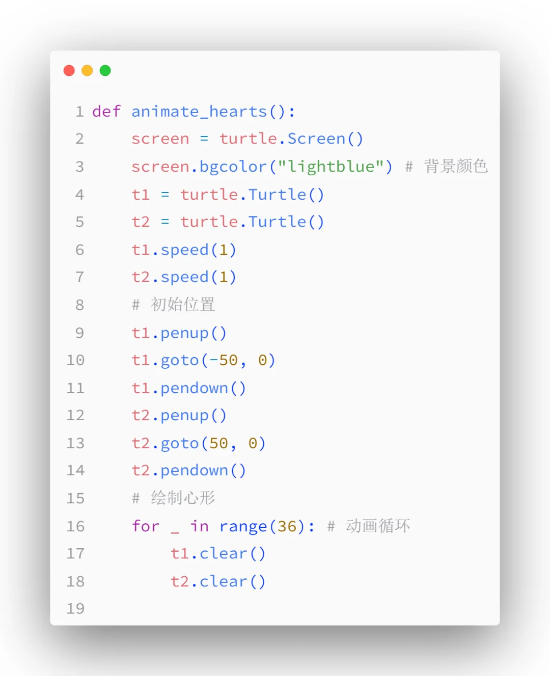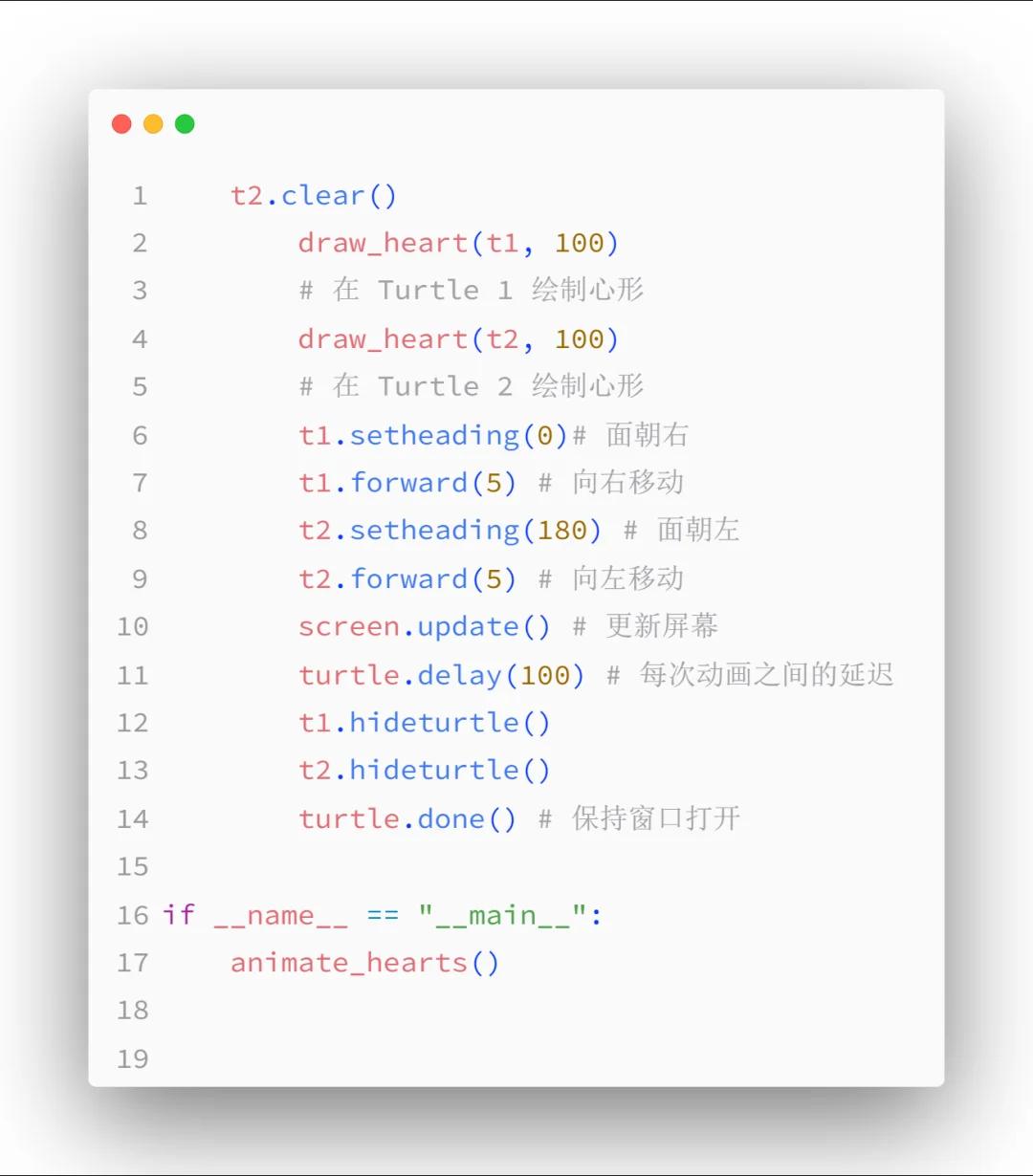宝子们,今天我要给大家分享一个超浪漫的 Python 表白代码!如果你和我一样,想在这个充满爱的季节里,用独特方式向心仪的 Ta 表白,那这个代码绝对不能错过~​ 🎈代码实现思路:​ 这段代码运用了 Python 的turtle库,通过定义draw_heart函数绘制爱心形状,再在animate_hearts函数里让两颗爱心从两侧缓缓靠近,模拟出一种心动靠近的感觉。​ 🌟核心代码解析:​ 在draw_heart函数中,先设置填充颜色为粉色,开始填充。通过一系列角度旋转和前进、画圆的操作,绘制出爱心形状,最后结束填充,一颗美美的爱心就画好啦。而在animate_hearts函数里,设置好背景颜色,初始化两只画笔t1和t2,在循环中不断清除之前画的爱心,重新绘制并移动它们,同时更新屏幕和设置延迟,实现动态效果。​ 💡使用方法:​ 把代码复制到 Python 环境中运行,就能看到两颗爱心慢慢靠近的动画啦。你可以根据自己的喜好修改爱心大小、颜色、背景颜色,还能调整爱心移动速度。要是你想表白的话,把这个动画分享给 Ta,再配上深情的文字,想想都超浪漫~​ 宝子们,赶紧行动起来,用代码传递你的爱吧!要是在运行过程中有任何问题,或者成功表白了,都记得在评论区分享哦~​