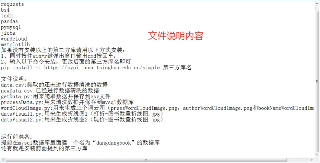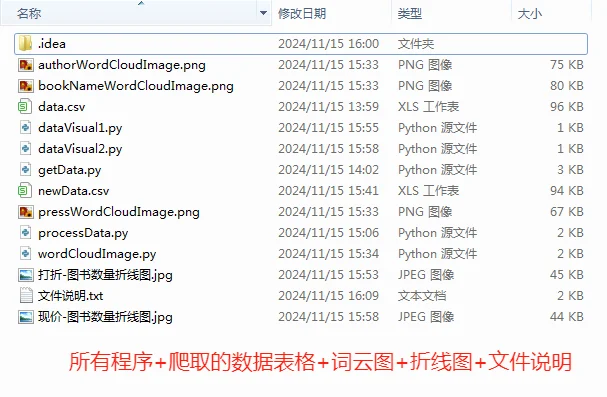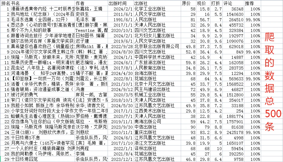 hello,大家好,好久不见❗️❗️❗️ 想要获取当当网上的图书信息、价格、评价?用 Python 爬虫轻松搞定!📚 在这个信息爆炸的时代,数据就是力量!通过简单的 Python 脚本,我们可以快速抓取当当网的图书数据,分析热门书籍、比价、甚至获取用户评价,助你做出更明智的购买决策!💡 今天给大家分享一个爬虫实例🤗 ~ [火R]程序任务 1️⃣分析某网站上的数据形式,确定爬取字段和解析方法; 2️⃣爬取并解析网页数据(requests模块和bs4模块); 3️⃣清洗数据(pandas模块); 4️⃣保存数据(csv模块和MySQL数据库); 5️⃣分词(jieba模块); 6️⃣可视化分析,生成词云图和折线图(wordcloud模块和matplotlib 模块)。 ~ [火R]图文说明 图1️⃣:数据来源,图书畅销榜图书数据; 图2️⃣:爬取的数据字段,10个; 图3️⃣:爬取的表格数据,500条; 图4️⃣~图6️⃣:生成的词云图; 图7️⃣~图8️⃣:生成的折线图; 图9️⃣:所有程序文件; 图🔟:文件说明。 ~ ⚠️由于代码太多,就不分享出来了,本次爬虫案例可作为新手练习或者期末作业都可以o(^▽^)o,所有程序文件都已经打包,需要的小伙伴可以 ,💌口令“爬取当当网数据代码”。 ~