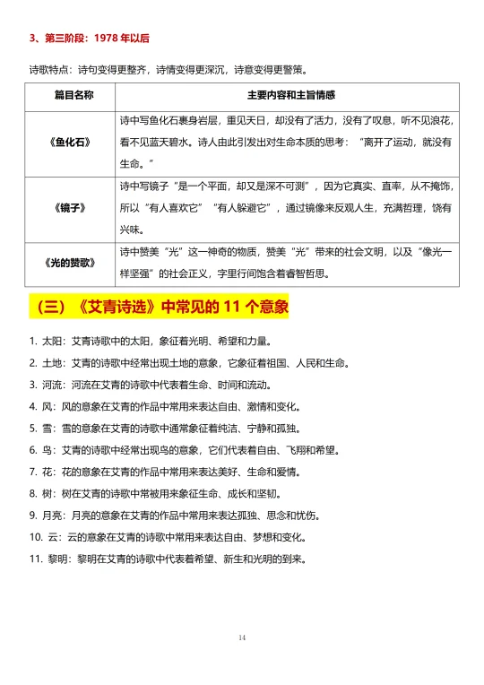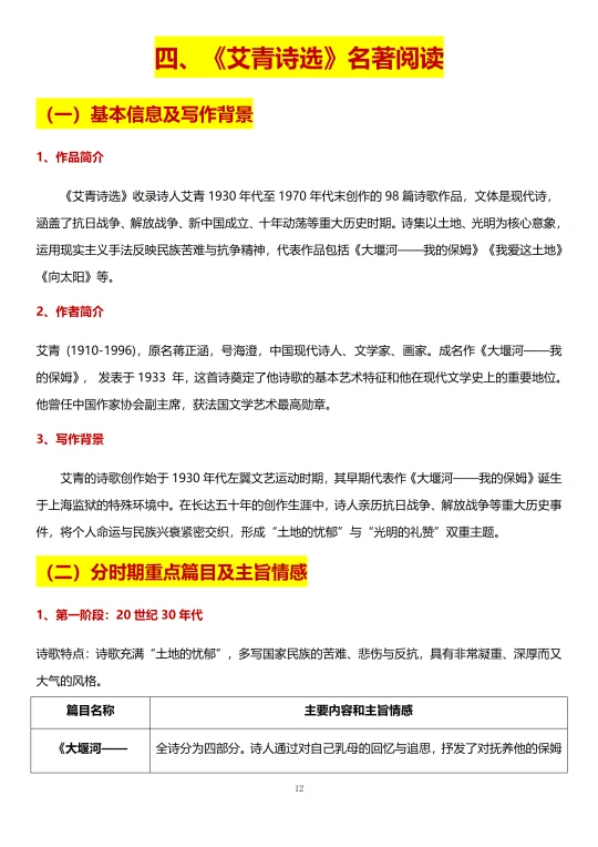 《艾青诗选》既是现代诗歌也是九上名著考试的重点。要了解其基本信息及写作背景、分时期重点篇目和主旨情感以及常见的11个意象。