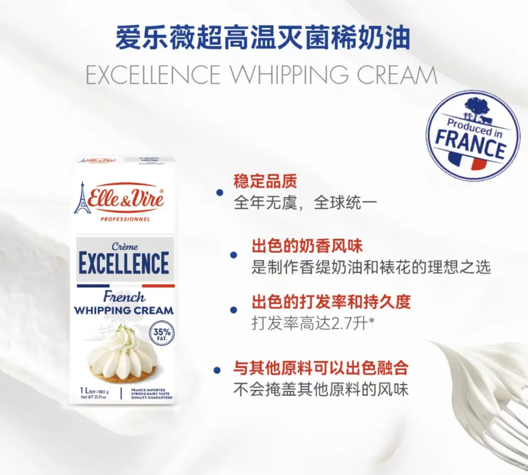 秉承着【自然本味一步到味】的爱乐薇是奶油界的高端优质食材。特别是爱乐薇超高温灭菌稀奶油,以稳定的品质、迷人的奶香风味、高达2.7升的打发率,让来到现场的MOF大师Niclas Bossin都拍案叫绝👍🏻