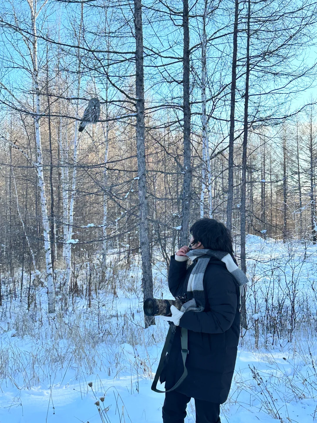 冬季的乌林鸮相比于其他三季还是略显胆小,不过之前在乌尔旗汉,也碰到了几只完全不怕人的个体,甚至我们几个人站在旁边和其中两只合了影,图里这只甚至落到了离我们不到五米的低枝上,手机都能拍清楚,相机就直接像这样毫无防备地爆框了[扶墙R] 看多了生境,偶尔看点大头照[doge]