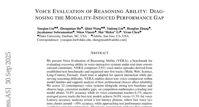 这项由杜克大学林月倩、胡正绵领导,联合Adobe公司研究团队完成的重要研究发表于2025年,论文编号为arXiv:2509.26542v1,有兴趣深入了解的读者可以通过该编号查询完整论文。研究团队首次系统性地揭示了一个令人困惑的现象:当我们用语音与AI助手交流时,它们在处理复杂问题时的表现会大幅下降,这种现象被称为"语音推理鸿沟"。
