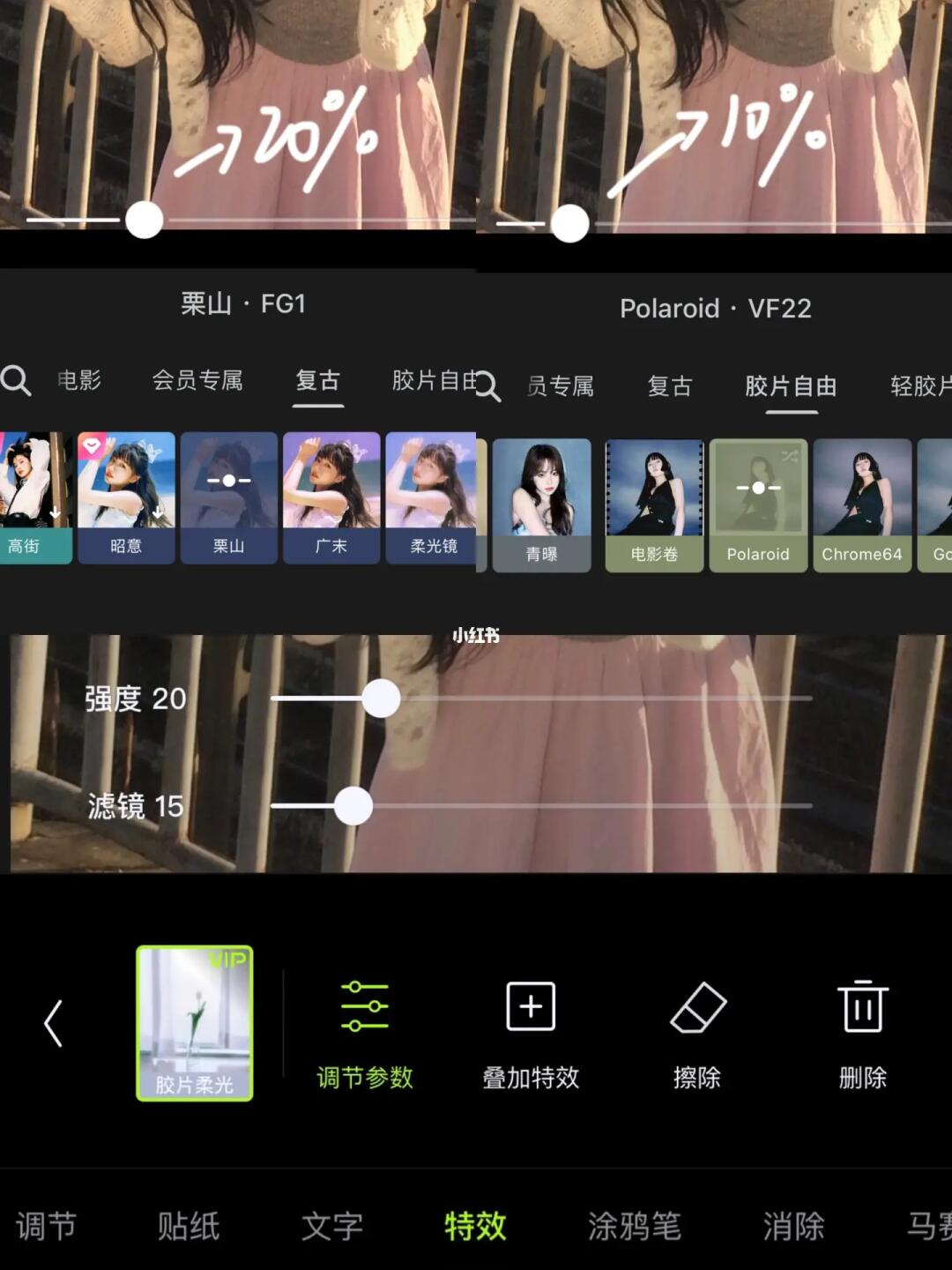 嘿嘿小兔叽在阳光下拍皂 给大家分享我的滤镜教程[萌萌哒R] 美🐰咻咻: 滤镜:栗山20% polaroid10% 再转到➡️ 🌟图: 特效:胶片柔光:强度20% 滤镜15% 得到的成片氛围感满满