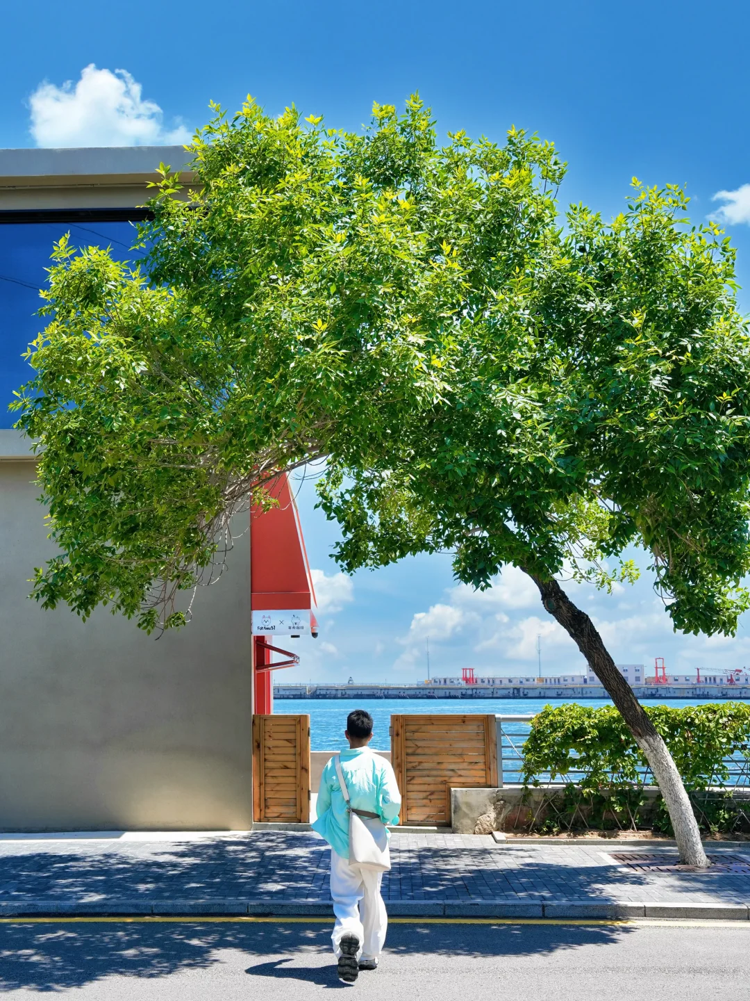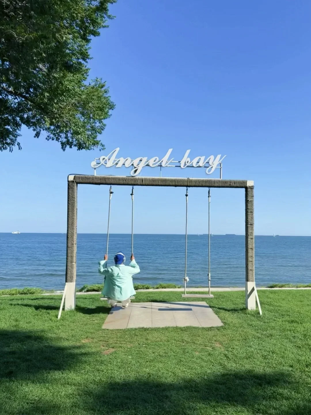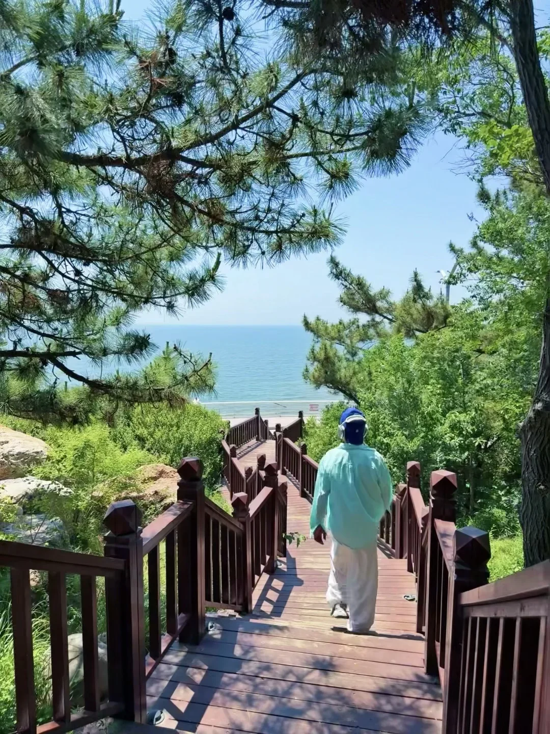 在这片海与天的怀抱里,你看那树影摇曳,海浪轻吟,仿佛世间的纷扰都在此刻沉淀。但只要你愿意像这样张开双臂,接纳每一缕风、每一束光,就会发现,内心的平静从不是远方的奢望,而是此刻你与世界温柔相拥的模样。