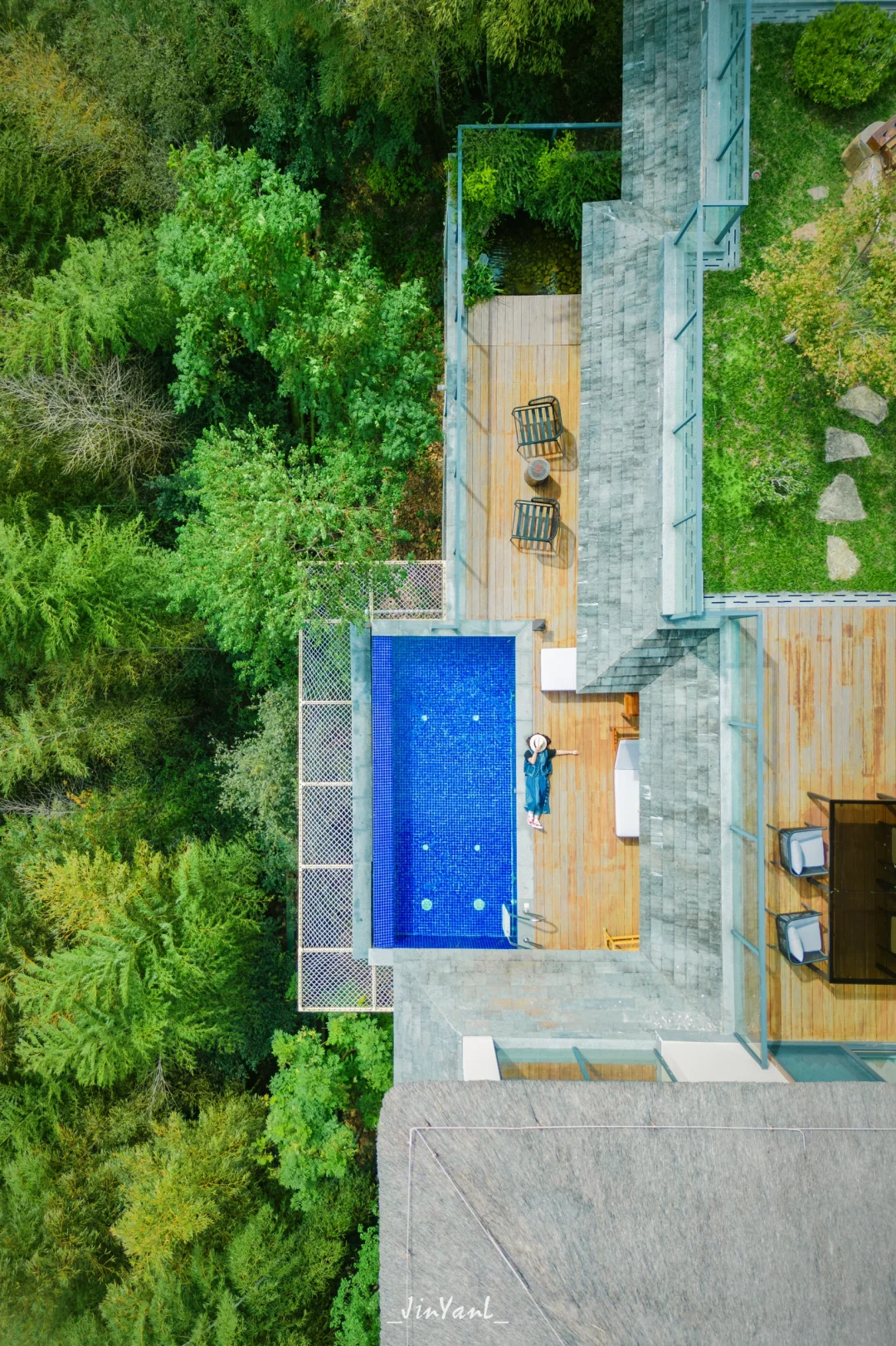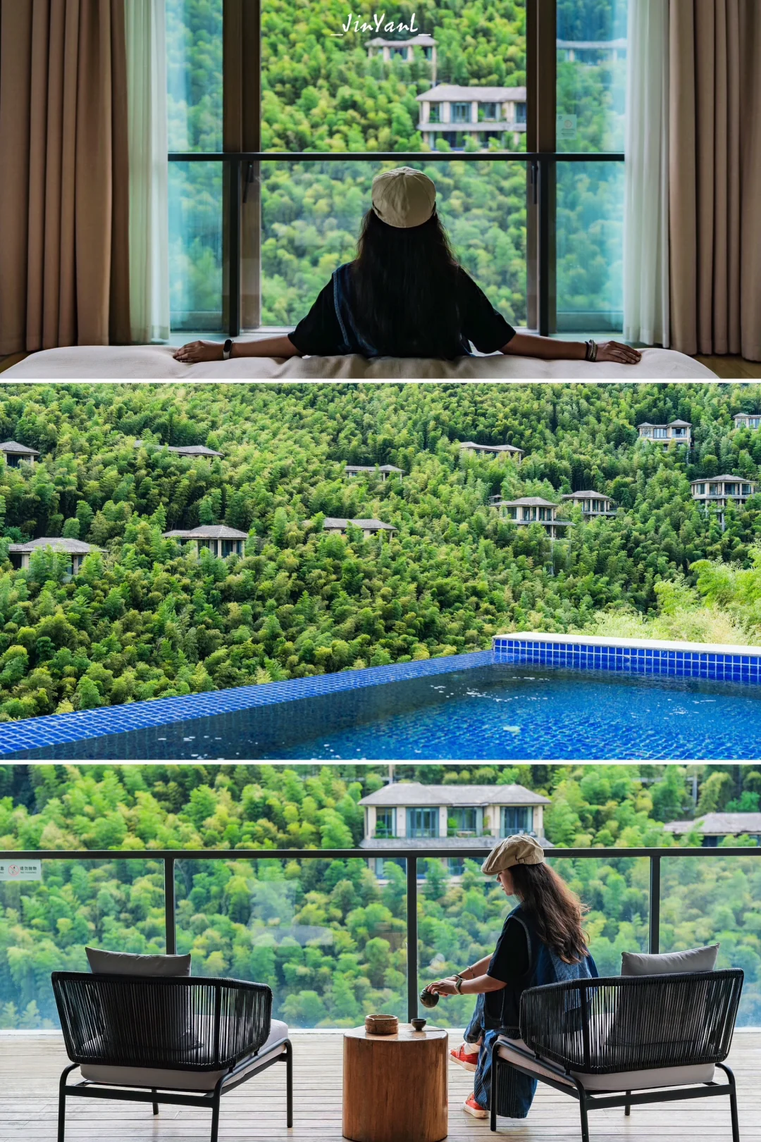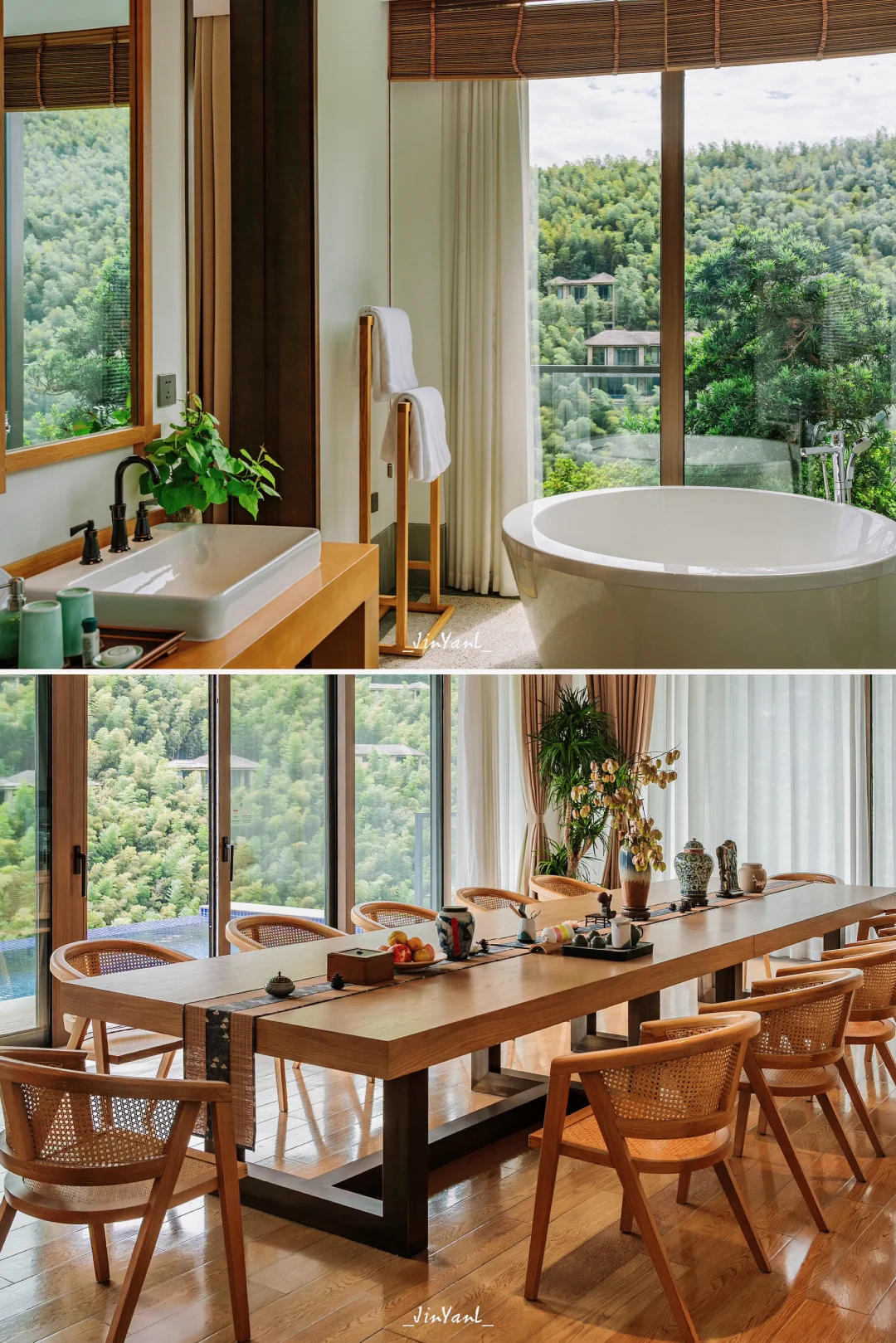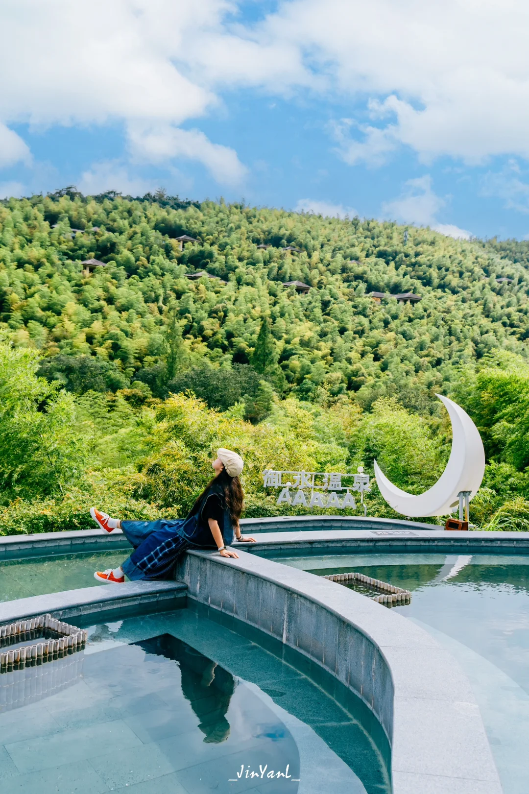 酒店的别墅错落在大片竹海里,推开窗就是竹林环绕,连空气都浸着竹叶的清香,除了不同功能公共温泉♨️,每间别墅自带天然温泉泡池