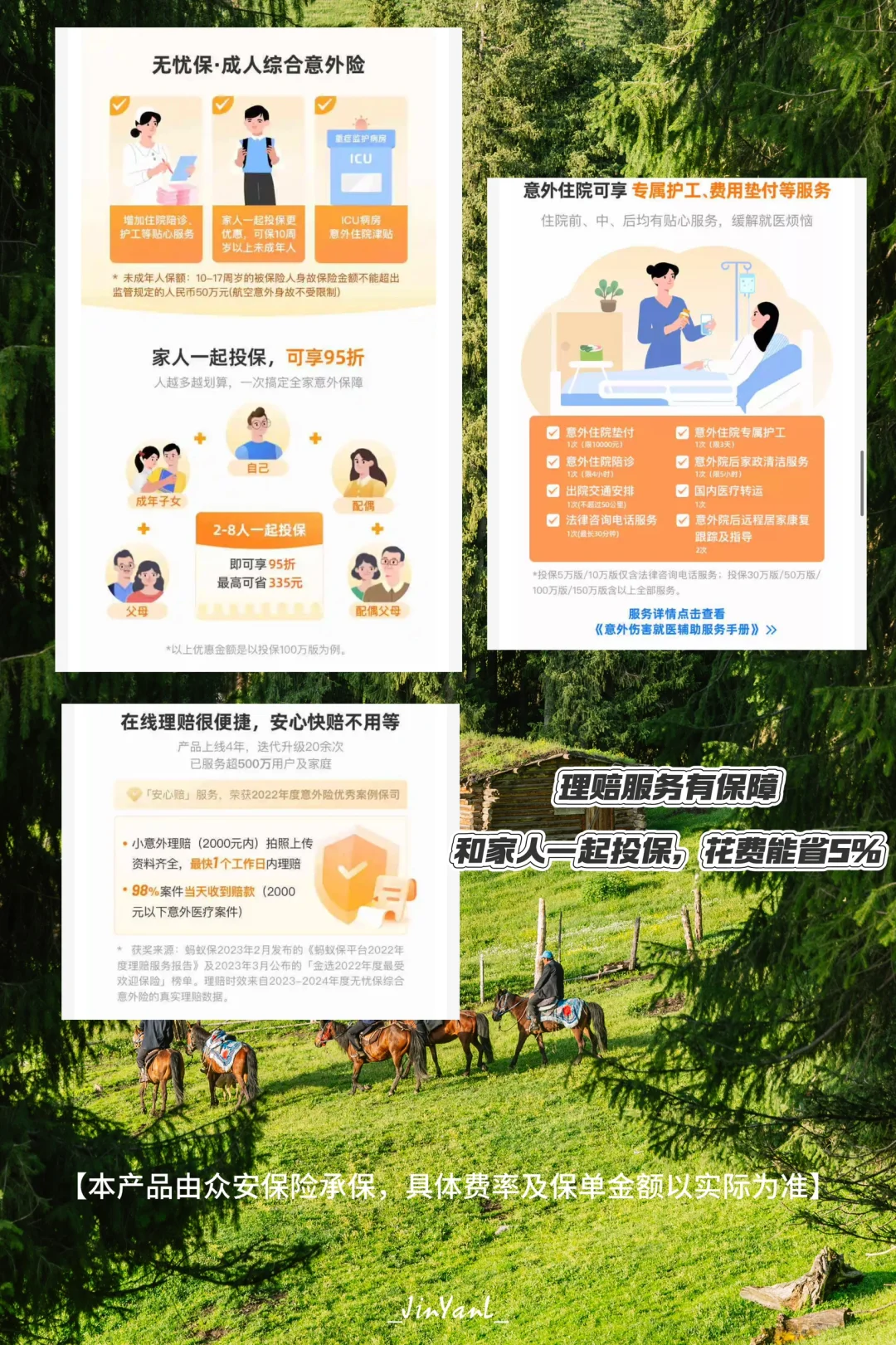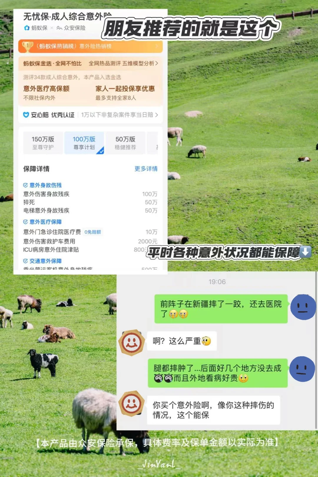 🤍重中之重:一定要备好保险!新疆地貌多样,像我上次和闺蜜出来玩,就因为前一天下雨草地湿滑,摔伤进医院了,耽误行程不说,还增加了一笔额外支出😭回来后跟朋友吐槽,才知道如果提前买好意外险👉就是这个【无忧保·成人综合意外险】,像这种意外摔伤需要就医的情况,看病治疗都能报销。这个保险我朋友每月续保,说是0免赔额,不限社保内外用药,检查费、治疗费都能报,她之前家里施工,在家帮忙时磕磕碰碰,用这个省下不少钱