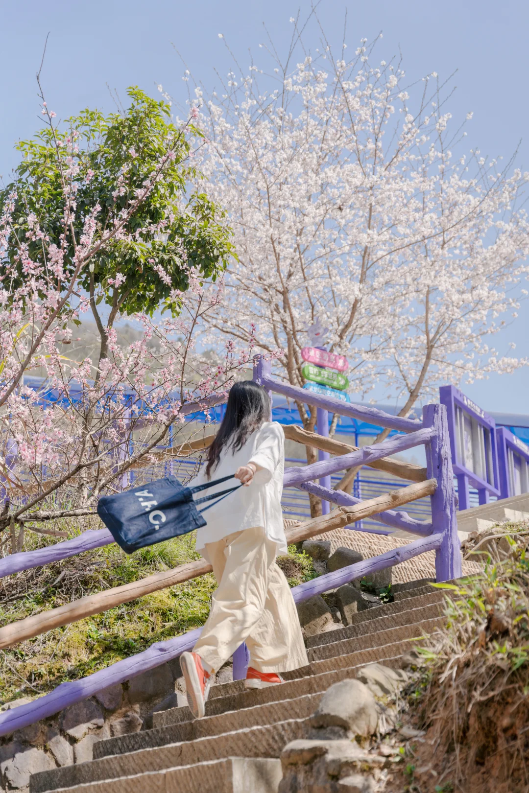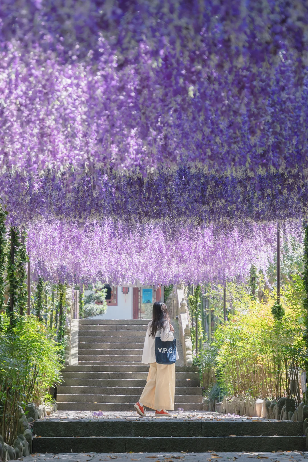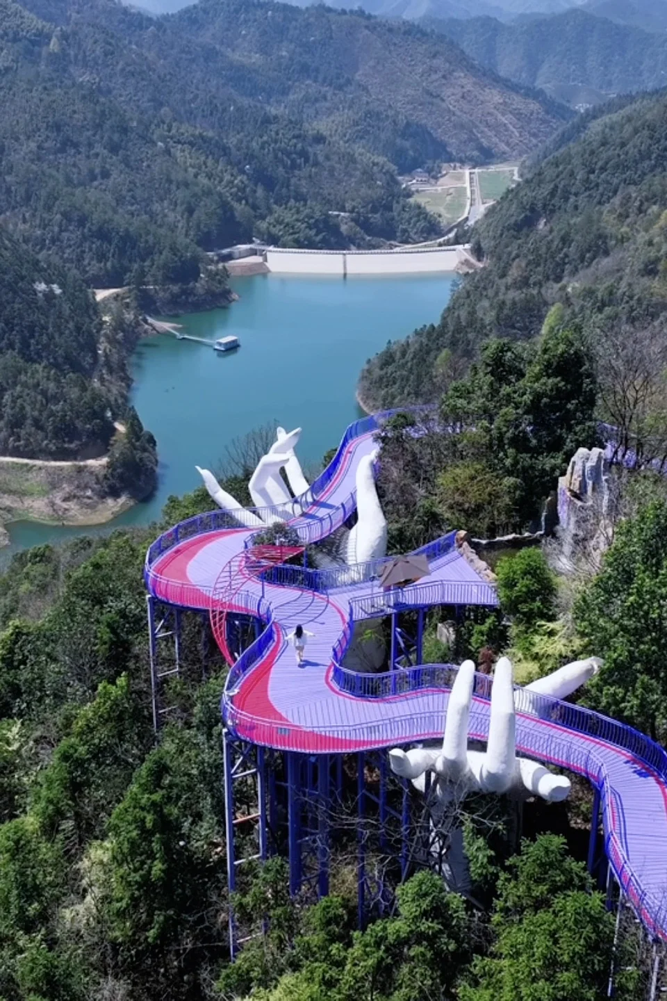 绝美机位预警‼️紫色栈道被巨型纤手托举,仿佛走进神话世界!穿白裙或浅色系,搭配紫色背景,氛围感拉满~