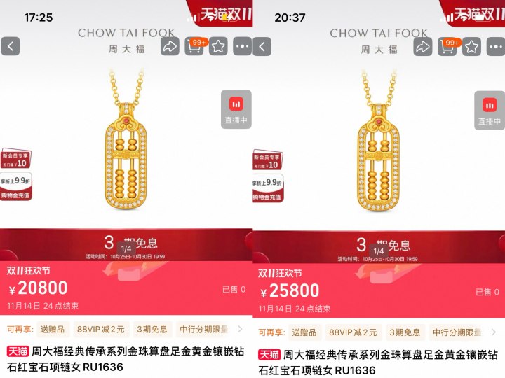 天猫官方旗舰店里,另外一款传承系列的丝绒金珠足金项链涨幅更大,从原来的13300元上调到了17800元,涨幅达到了33.84%。