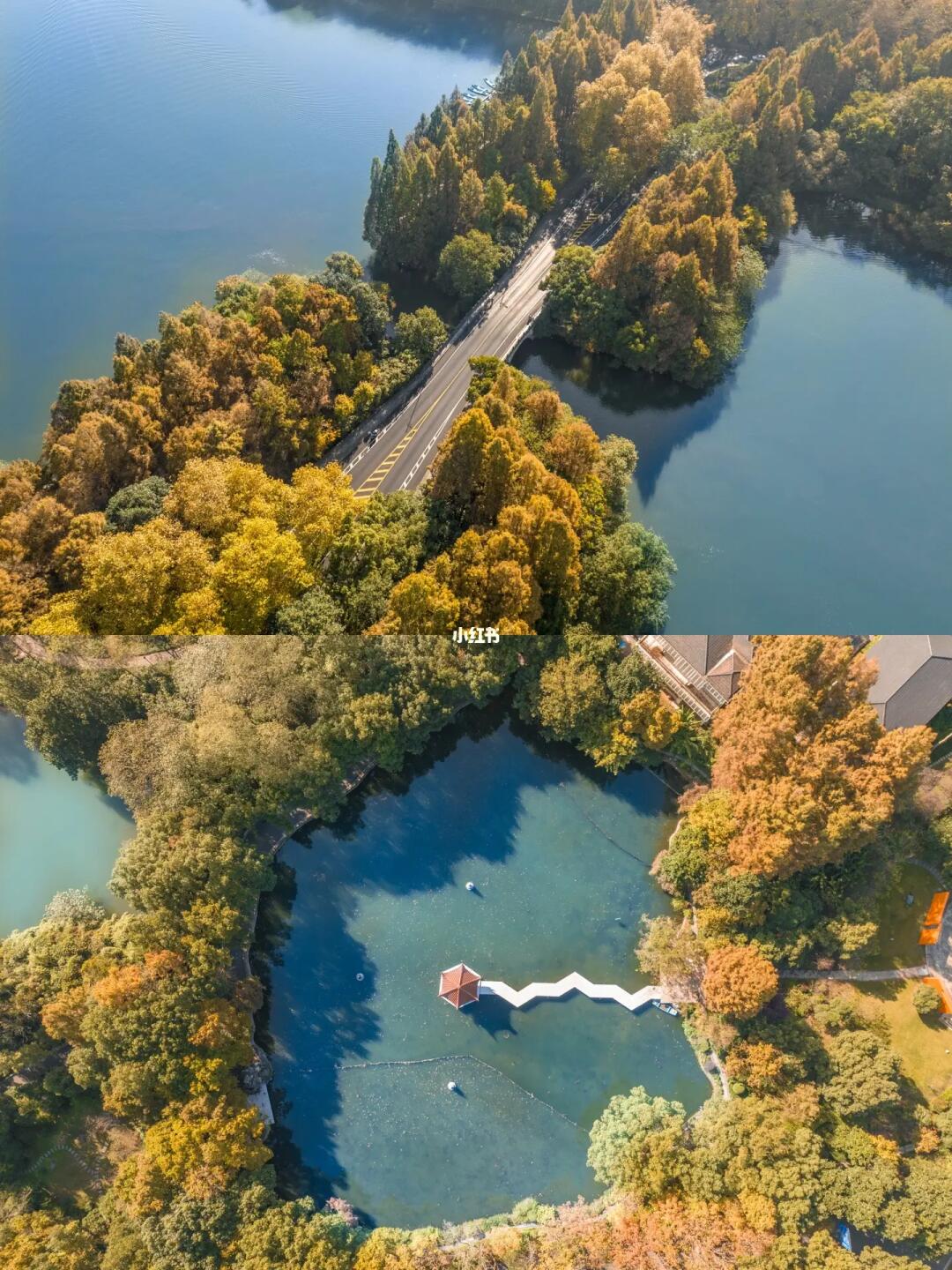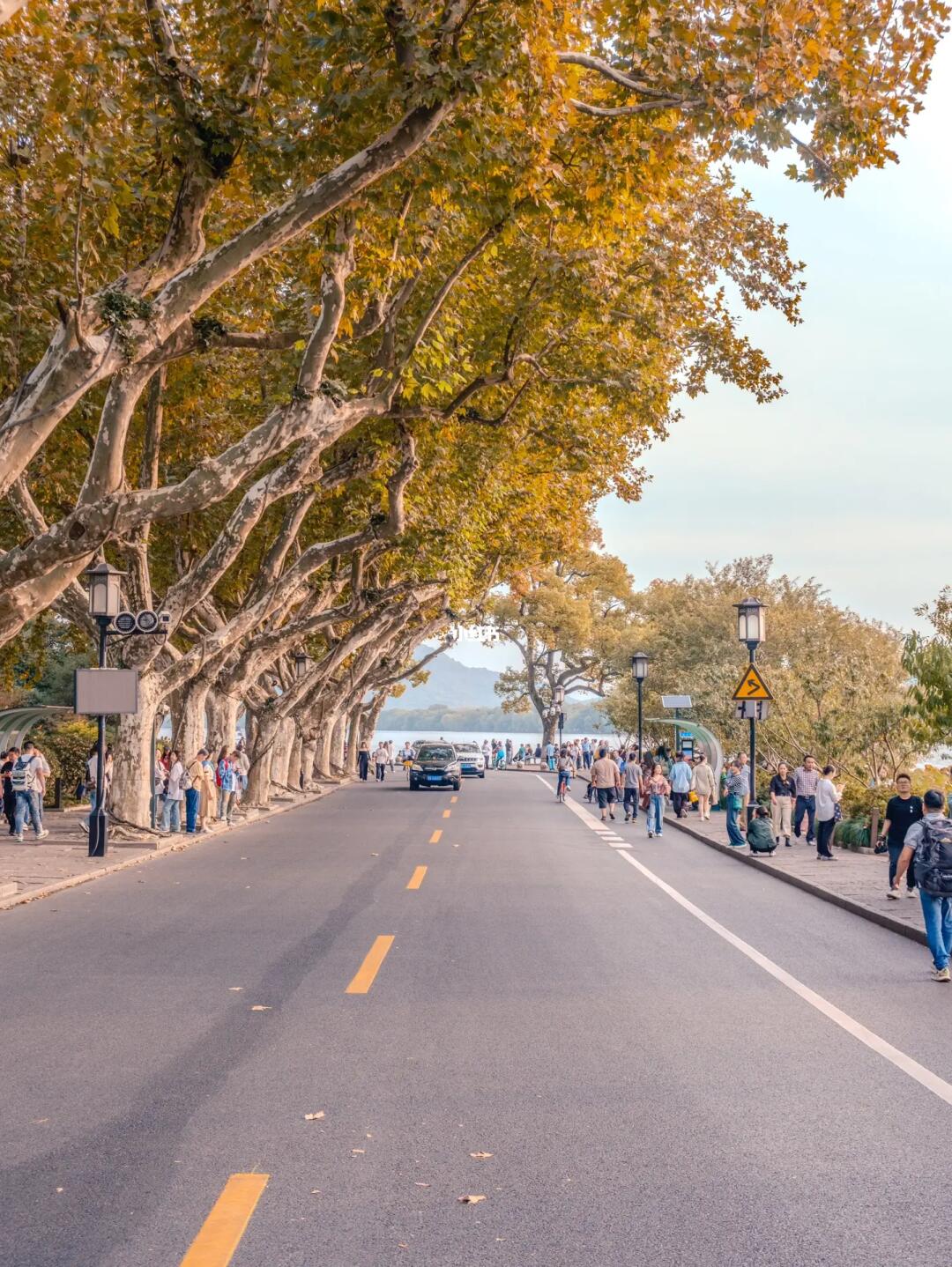 西湖“zui火”拍照机位之一。高大的梧桐枝干延伸至公路上方,路在西湖的岸边转弯,随便怎么拍照片都是非常出片的(建议早晨来人较少的时候更加出片)